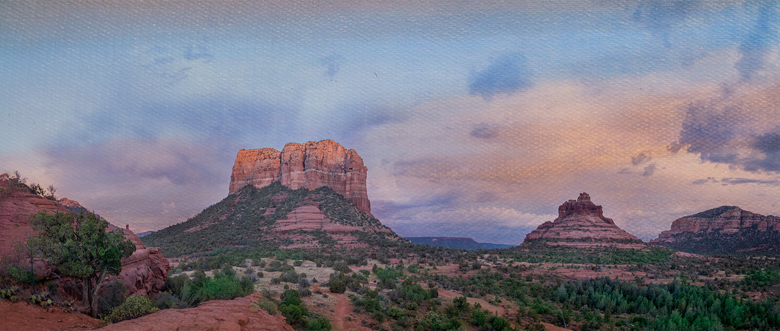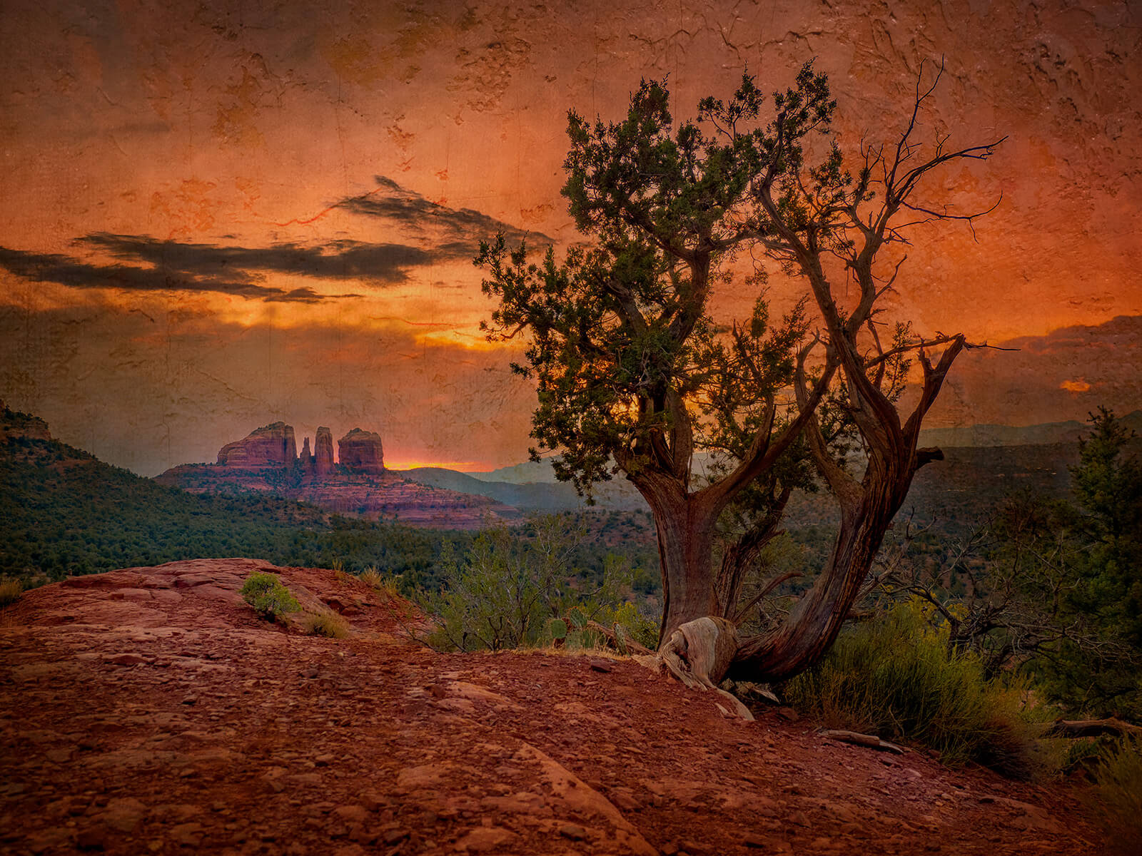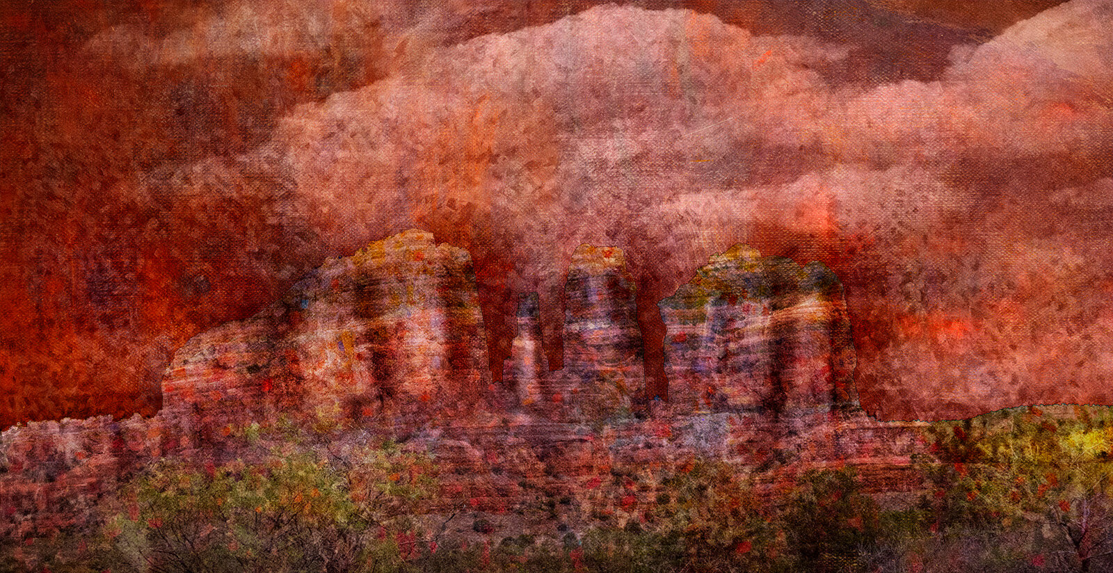 At the time I was concentrating on the capture of the panoramic image. I felt, rather than saw, that I should look behind me. The sky was coloring up beautifully behind the silhouette of the back side of Cathedral Rock. I processed for the natural shot then it was playtime with other images, textures, blend modes, layers and masks.