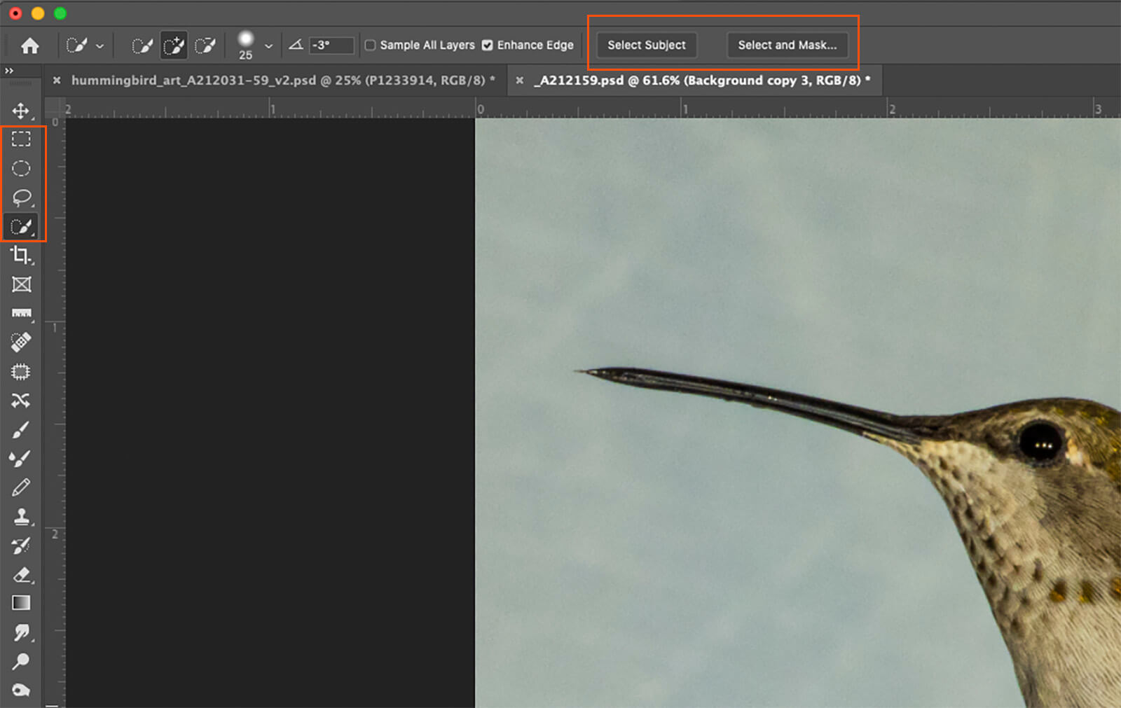 Select Subject can be a solid choice when you have a subject that is in focus against a softer background. It looks for sharp edges, contrast and color, and has been programmed by looking at well over a million images to help it make those decisions. I find it keeps getting better and better as time passes. After that initial selection is made, you access the selection tools to enhance that by using the Select and Mask button.