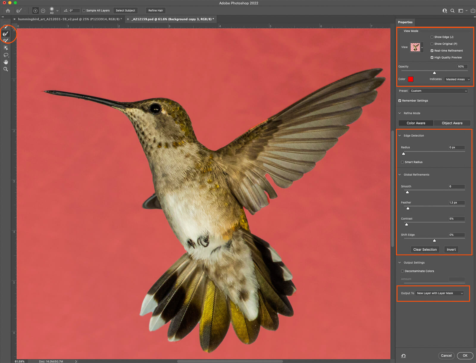 Select and Mask is a section that could use an entire tutorial to use to full advantage. Learn this area by watching some in-depth videos or getting in there and playing with the settings, pushing them to the limits, to learn their use and capabilities.