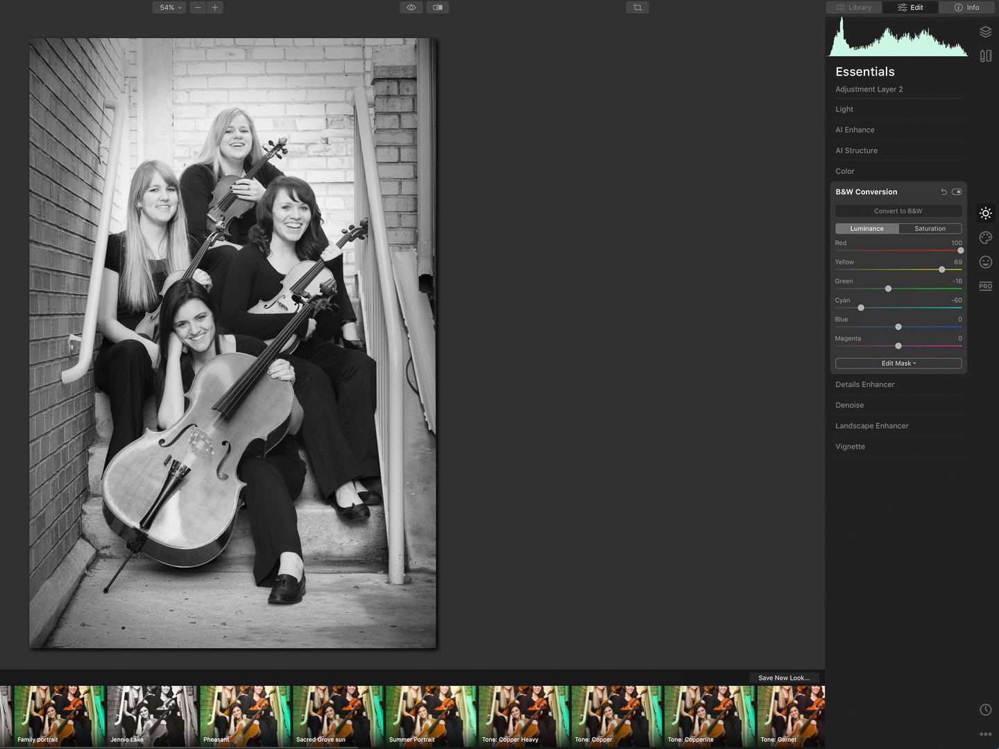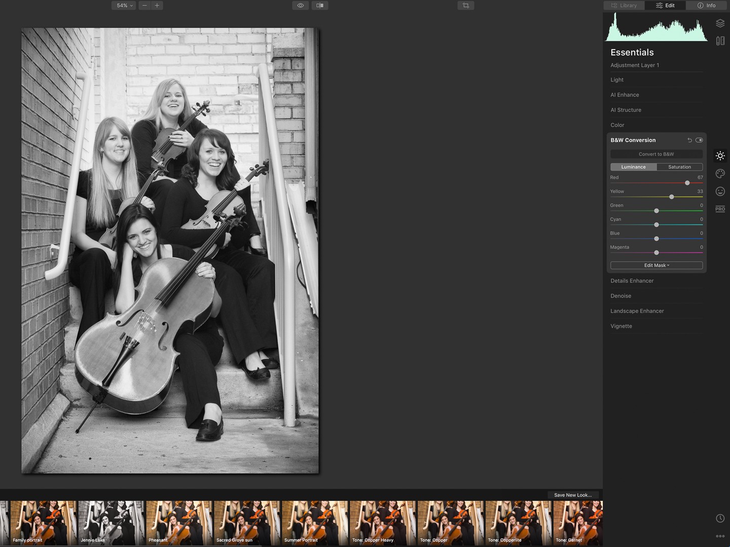 In the B&W Conversion tool, use the red and yellow sliders to brighten those tones to make the skin tones stand out. I usually also darken the blues and greens for better contrast, but this picture doesn’t have any other colors. As a result, the area at the top of the picture behind the violinist’s head is bland and kinda like a halo. She’s good, but not that good ;)