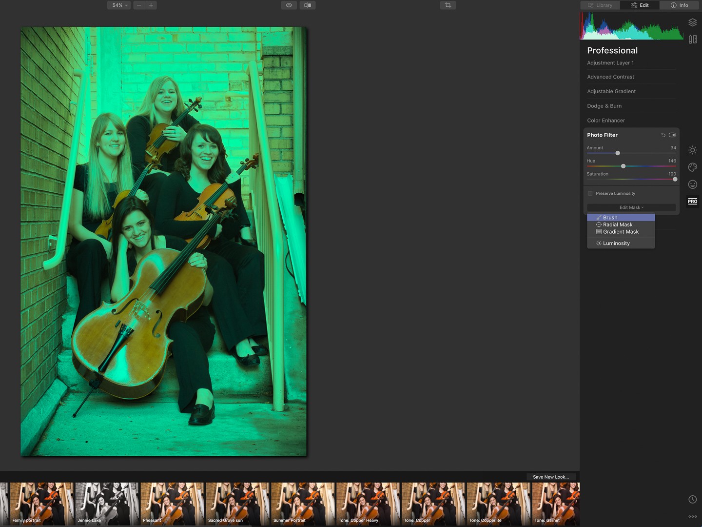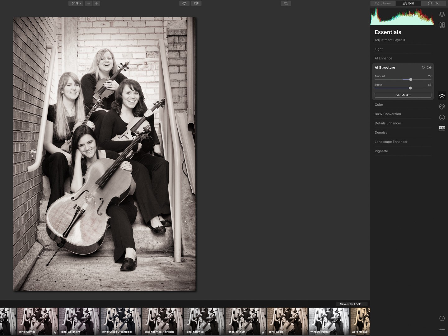 Finish the look by using AI Structure. The artificial intelligence is trained to recognize people and it doesn’t add structure to their faces and skin, which would be too much detail. In this case, it finishes off the details on the edges really well. Lastly, add a little warmth with the Split Toning tool. There are presets, but I like to make my own.