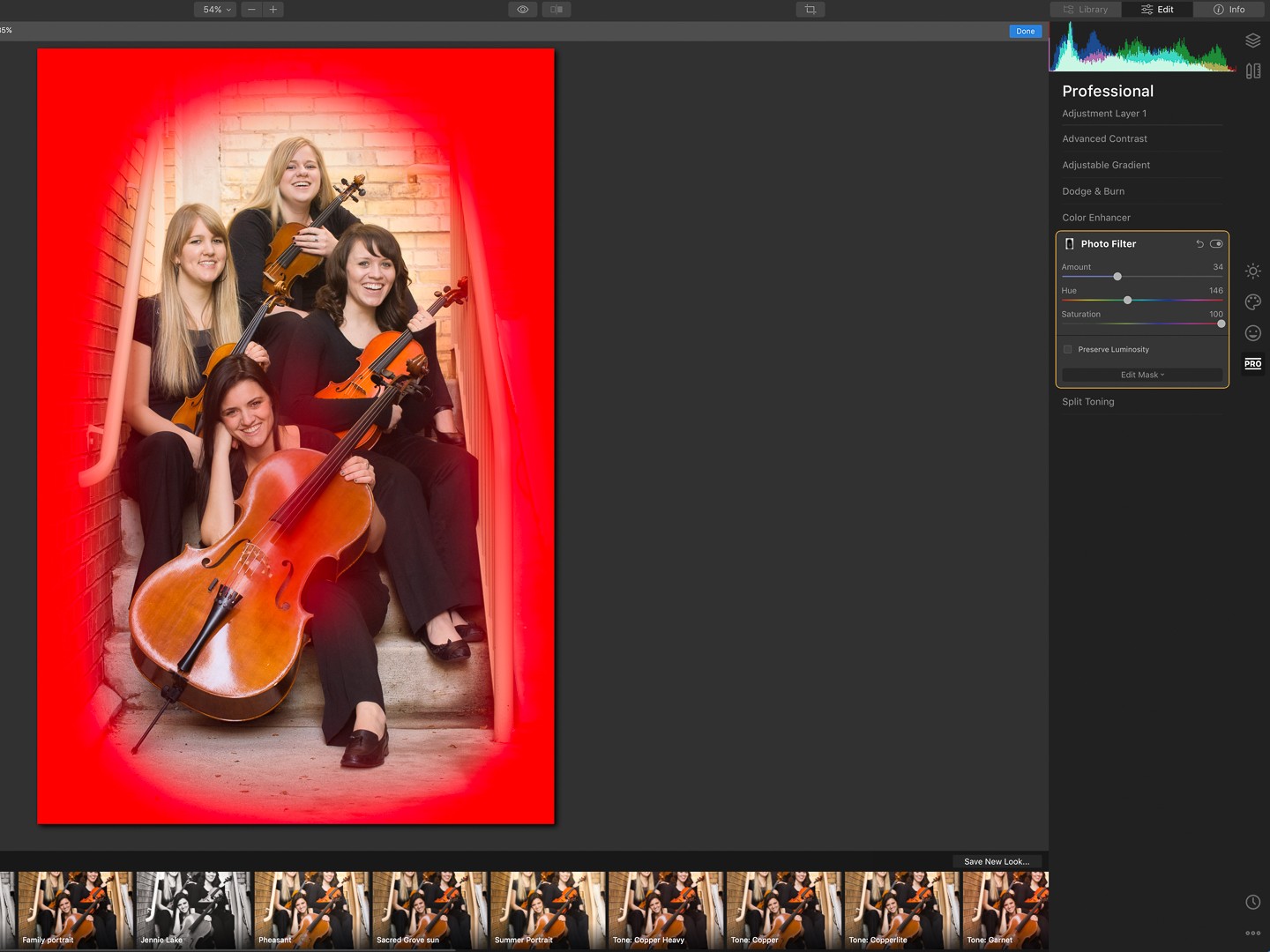 But the color contrast is only needed on the edges, so use the brush to erase the color from the subjects. You can use this method to create a vignette is a different manner, too. This red mask shows where I’ve left the cyan applied; everywhere else it’s been erased.