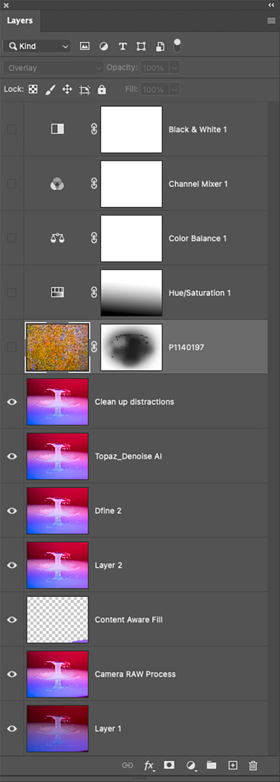 I used two different noise reduction plug ins to add some smoothing to the scene. Nik Collection’s Define 2 gave a decent result but there were some spots that needed more attention. I invoked Topaz DeNoise AI, which took care of the rest of the noise.