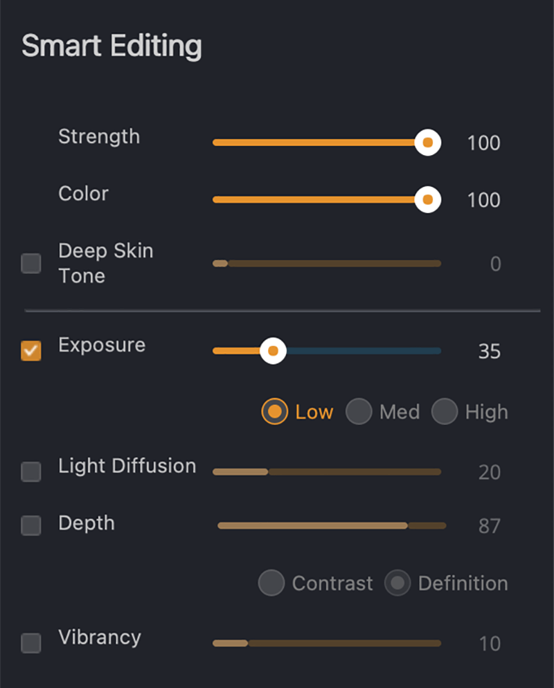 The Smart Editing panel offers the strength, color, and deep skin tone adjustments. Strength is powerful and deals with the contrast and tone of the image. It also seems to improve the image sharpness. Color helps adjust overall tint and vibrancy, and Deep Skin Tone helps correct saturated skin tones.