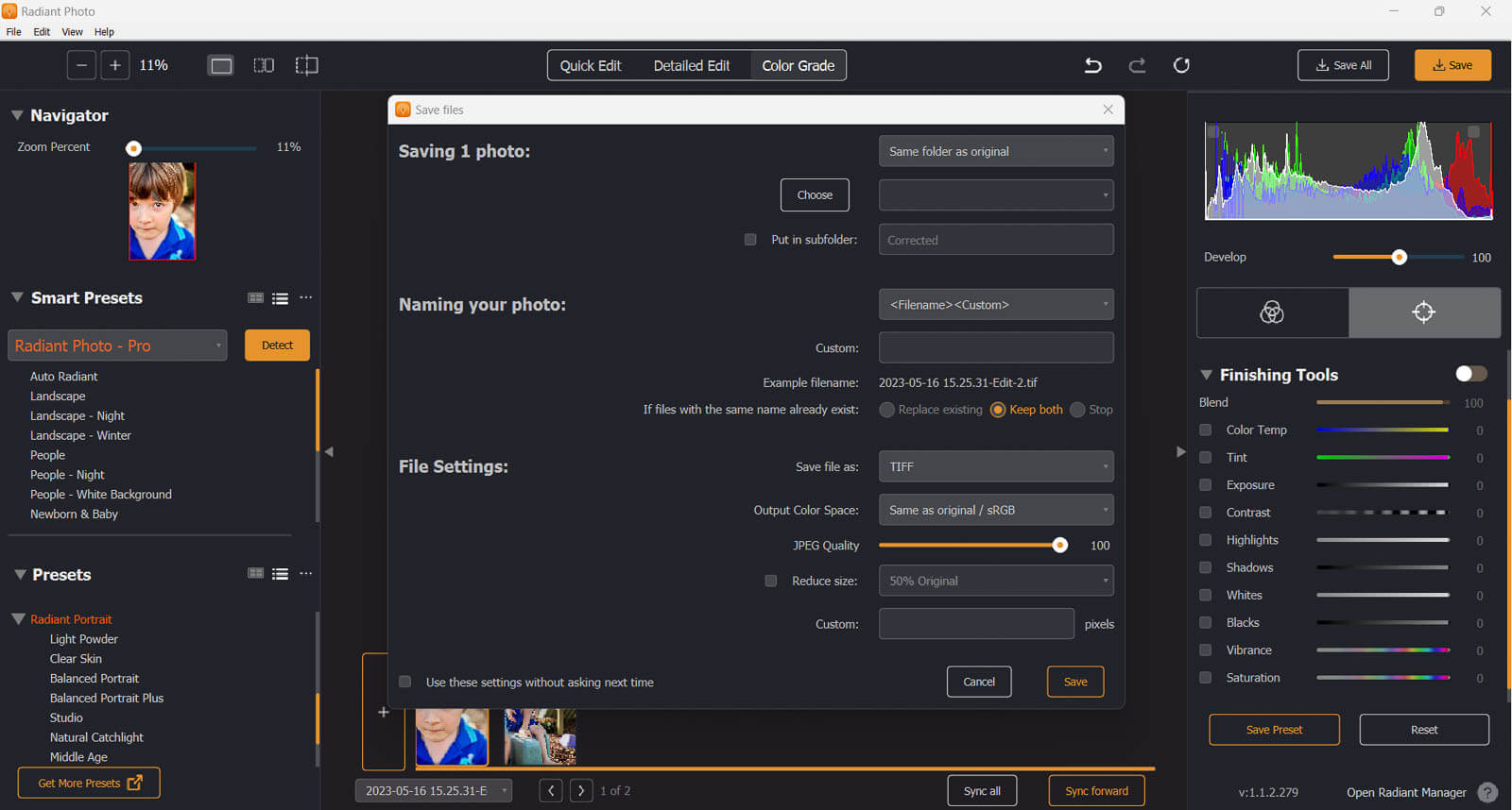 Usually for me, final steps are exporting for client delivery or publishing on SlickPic. Depending on your workflow, Radiant Photo’s Save step might be the last step in your process.