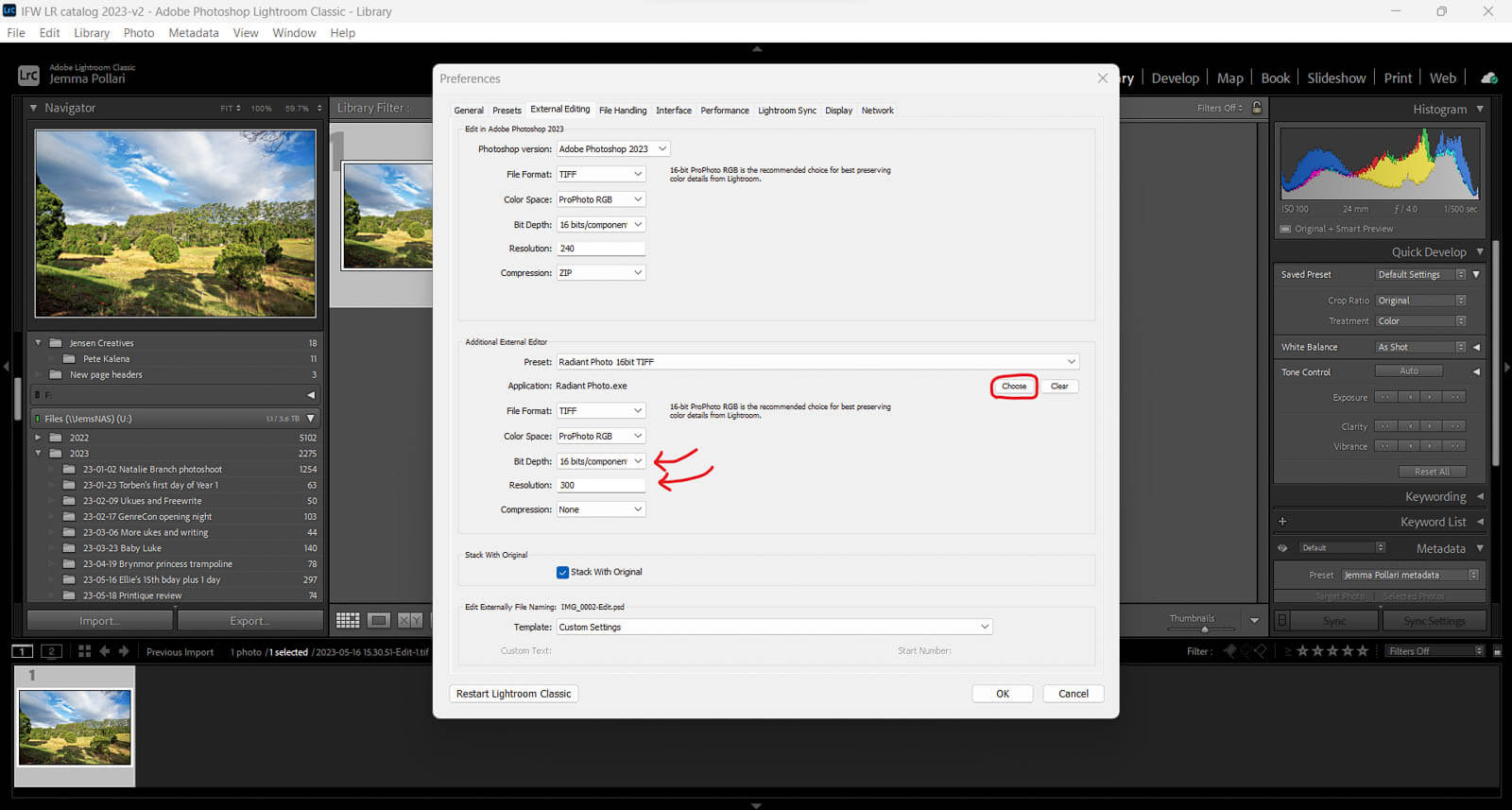 Give your preset a name (like Radiant Photo 16 bit TIF). I set the resolution to 300 dpi and choose 16 bit for best quality. When you next go to use your Edit In menu, the new preset will be ready to use.