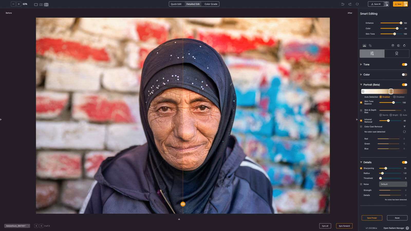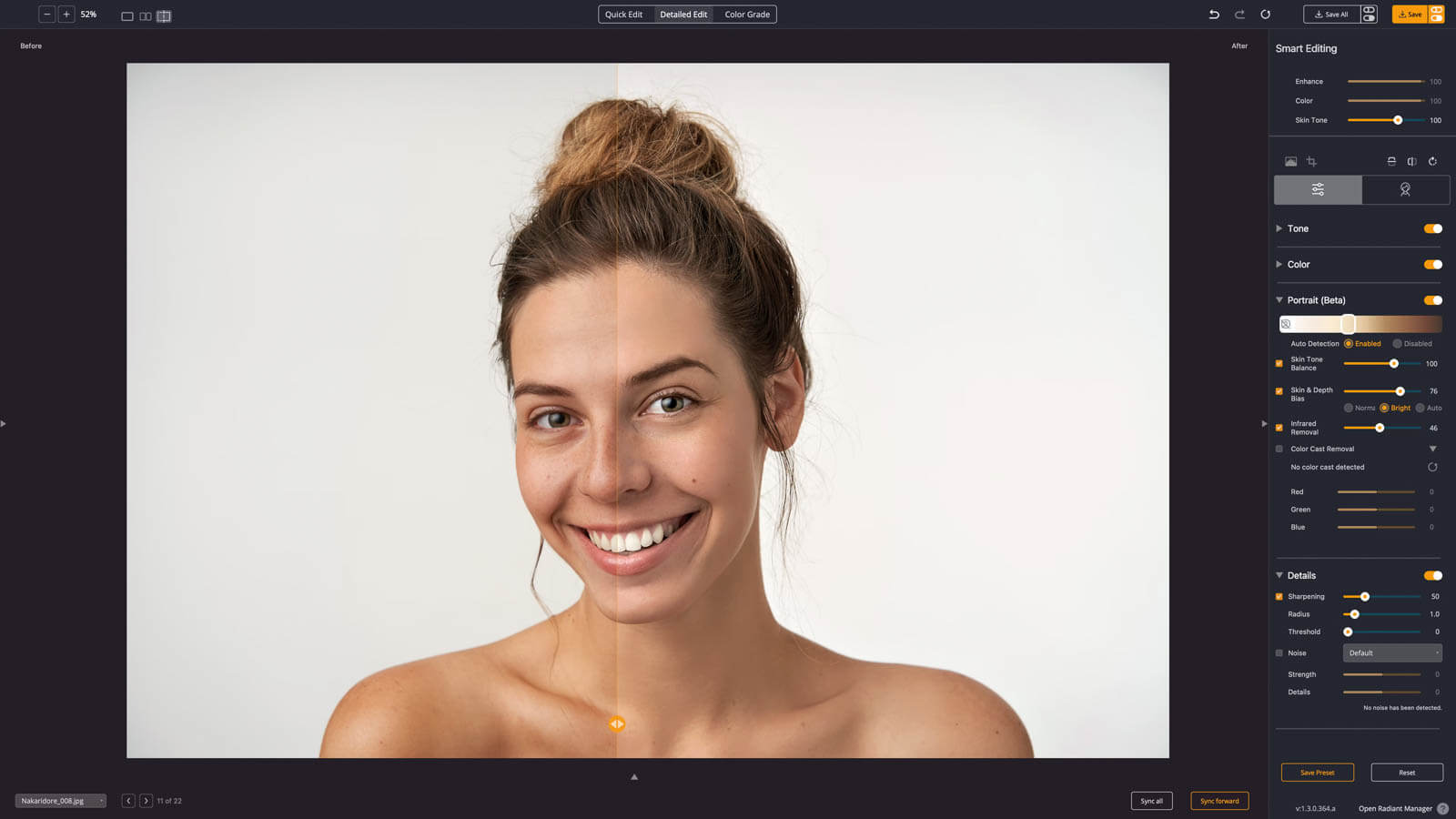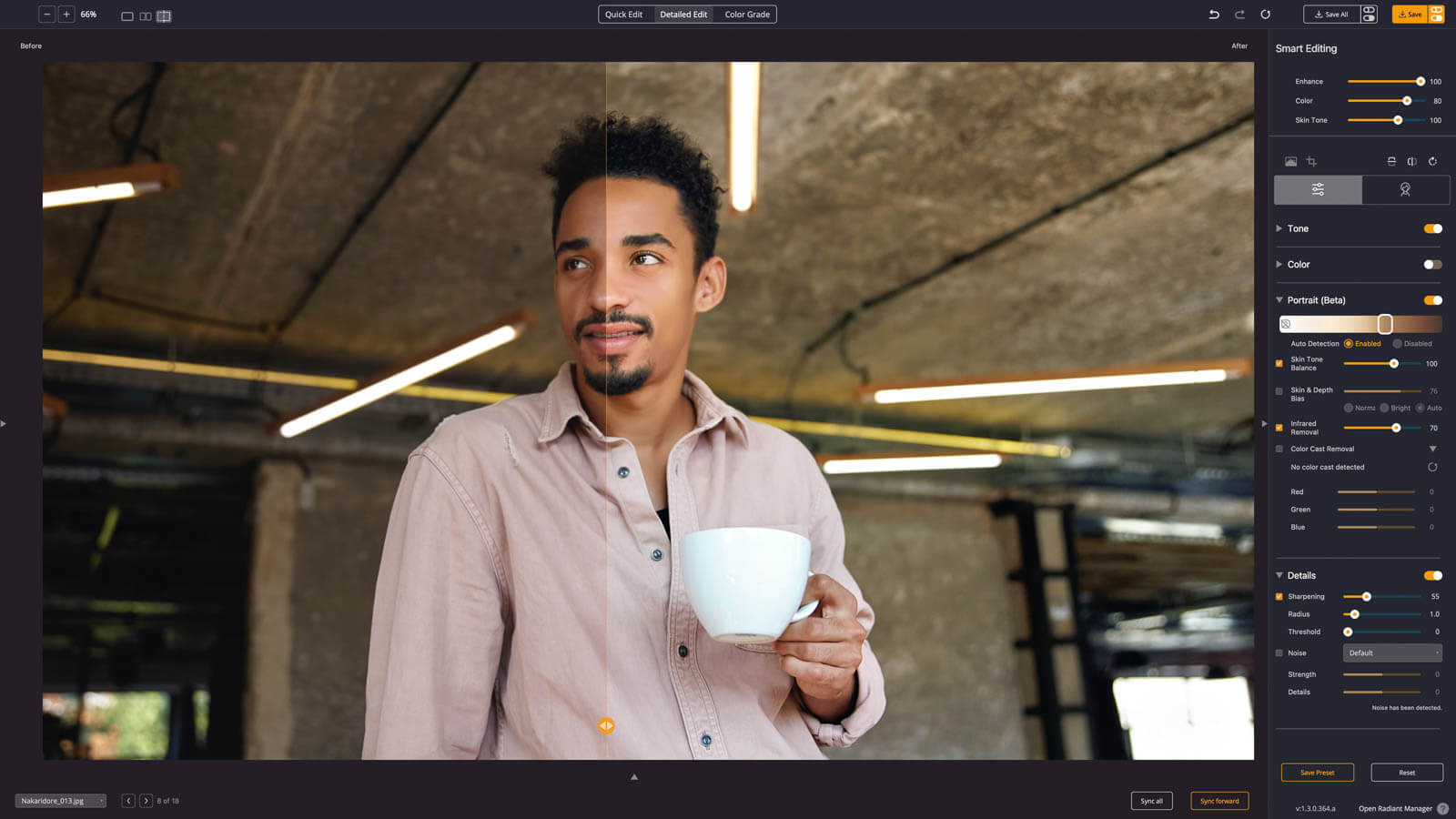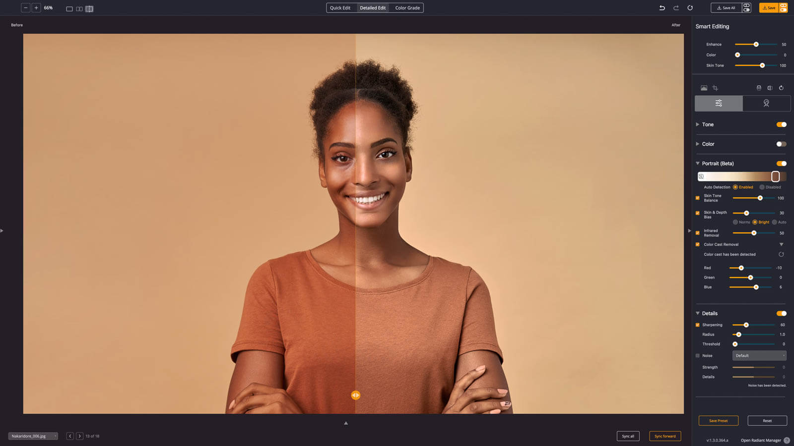 Infrared Removal and Color Cast Removal are new additions as well. Camera collect more infrared light than the eye sees, which adds unwanted red to an image. This automatically detects and removes the effect. Similarly, when shooting in environments with colored backgrounds, walls, ceilings and so on, an unwanted color cast is easy to fall prey to. The Radiant Photo new portrait tools remove this automatically.