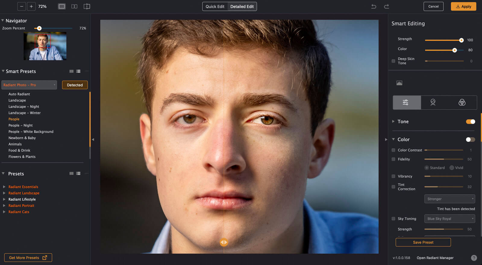 When you open an image, Radiant Photo analyzes each image and suggests edits that it feels is best for each photo. Rather than applying presets, it attempts to bring out color, detail, and light in each photo.