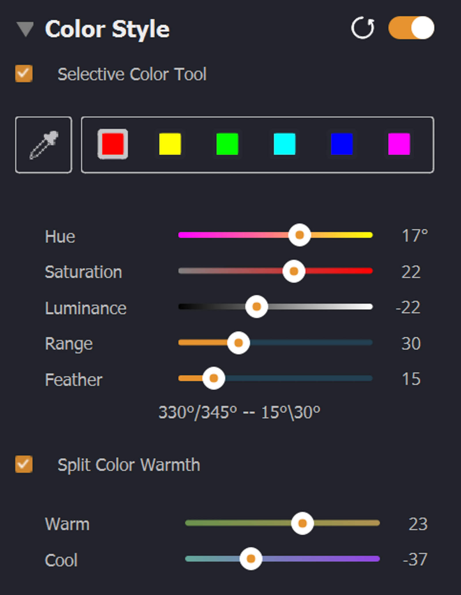 Split Color Warmth is another new addition to the Color Grade tools. You find it in the same place as Selective Color. This tool lets you separately control the Color Warmth. With one slider you can warm all the cool colors, and visa versa.