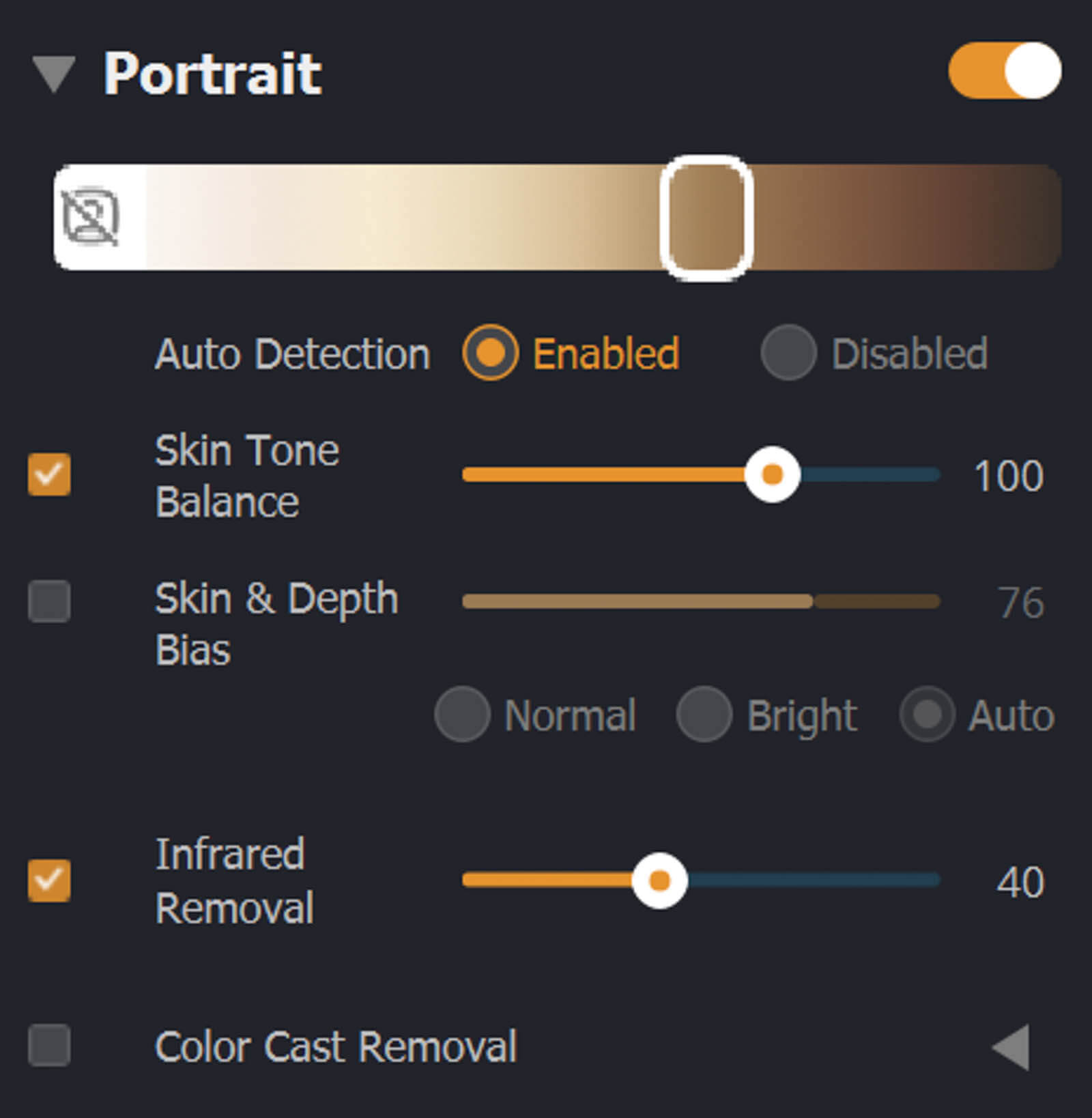 Turning on Color Cast Removal corrects this, to even skin tone and make for a more pleasing portrait.