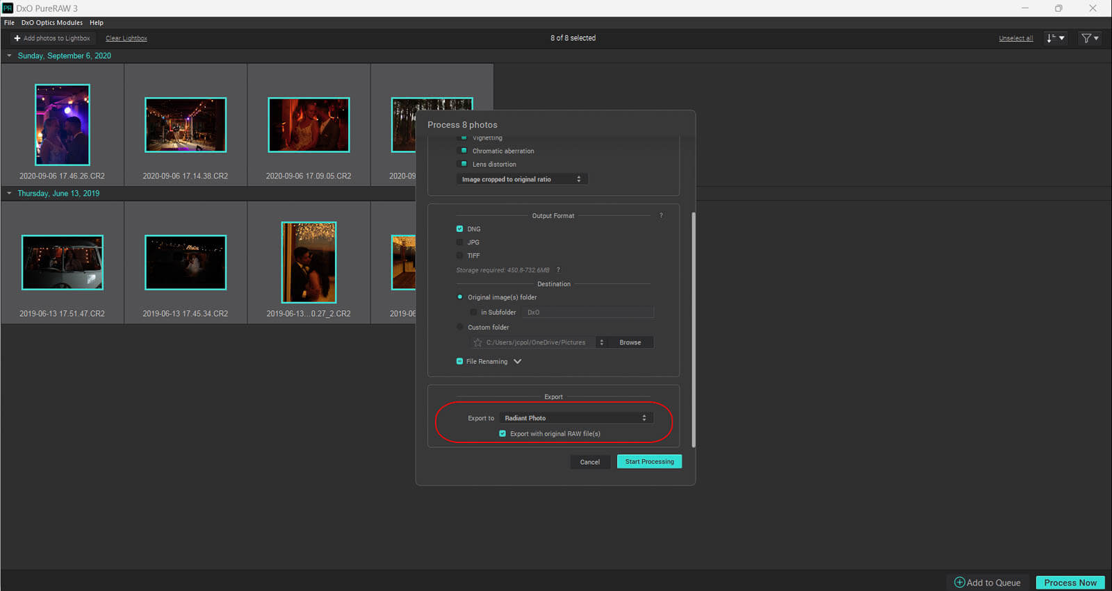 To process your photos in DxO PureRAW3 before finishing in Radiant Photo, choose the option to Export to Radiant Photo. I processed these photos with DeepPRIME XD. The process time makes this a press Start Processing and come back later kind of task. The results are worth it, though.