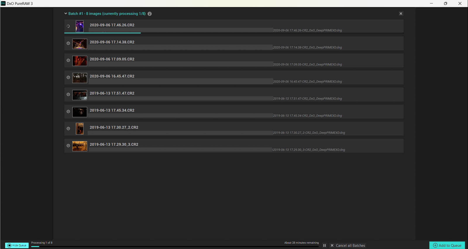 Import photos into DxO PureRAW3 and process with DeepPRIME or DeepPRIME XD