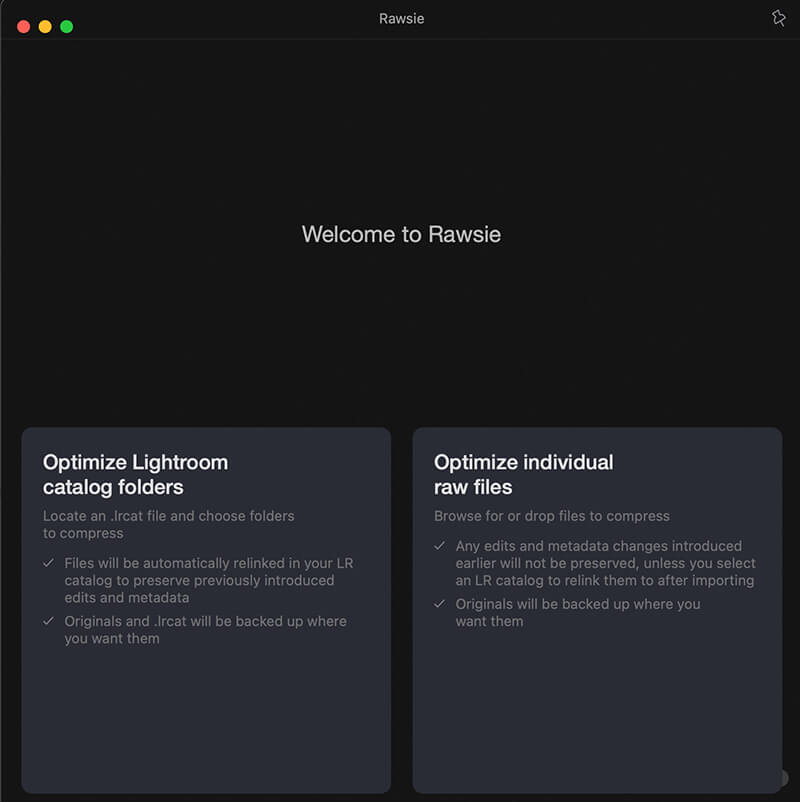 The interface is as easy and intuitive as it gets. You can upload individual raw files, or choose Lightroom catalog folders. The latter preserves metadata and any previously introduced edits. Rawsie can move the originals to an uncompressed folder and put the optimized versions in another folder in the same directory, or can move files to a folder of your choosing. Then, you are free to edit the file in your software of choice, enjoying both speed and size savings.