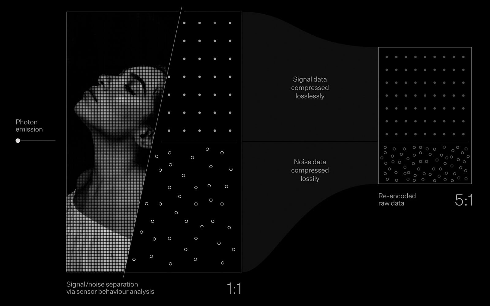 Rawsie takes DNG a step further by increasing the file size savings while still providing unmatched image quality. The app optimizes the noise encoding at the raw pixel level without compromising the signal. By analyzing and separating the signal and noise, Rawsie can compress the signal data losslessly but compress the noise data lossily to achieve optimal results.
