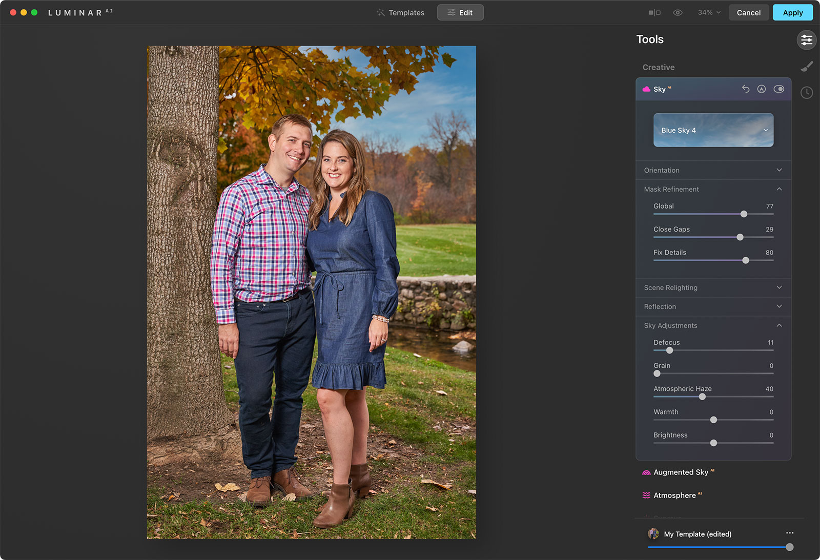 I originally had trouble with SkyAI when I shot these photos, but with the latest update to LuminarAI, I decided to give it a go again. The updates to SkyAI made it easy to replace the sky and make it look realistic. I was able to close the gaps and make sure the details stayed in the scene. No more halos around the leaves or around my two subjects.