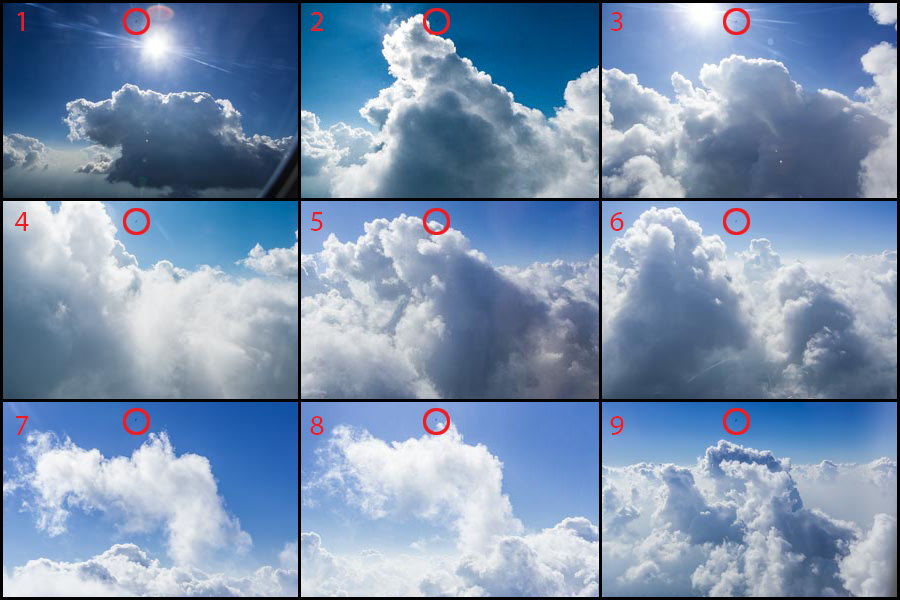 The first one is the “most” selected. It’s the one that gets worked on with the Spot Removal tool. To see all of the dust click the Visualize Spots box. Learn more about this tool here. Below is a sequence of the cloud photographs. The dust spot is in the same place on all nine photos.