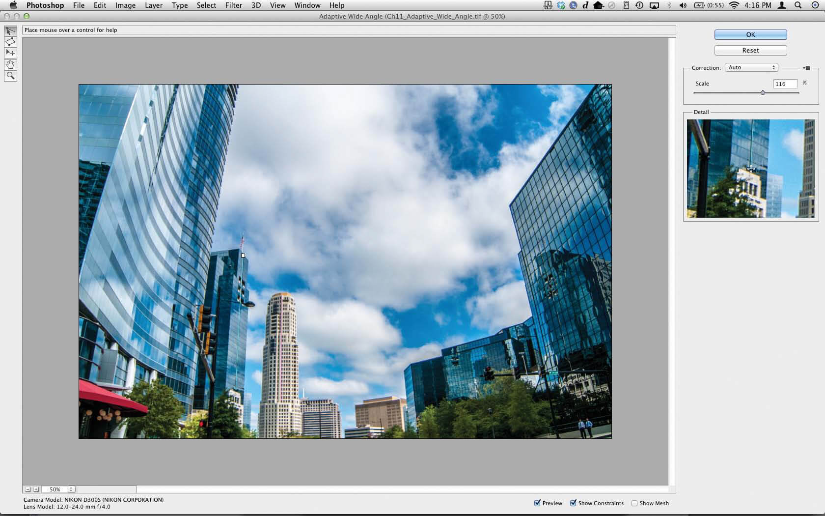 A common flaw caused by wide-angle lens is distortion. If you shoot with a very large field of view (wide-angle rectilinear or full-frame fisheye), the photo will often show a bending of straight lines and other distortion near the edges of the photo. The Adap- tive Wide Angle Correction plug-in can fix perceptible distortion. The plug-in requires only a small amount of input from a user to know which lines should be straight.