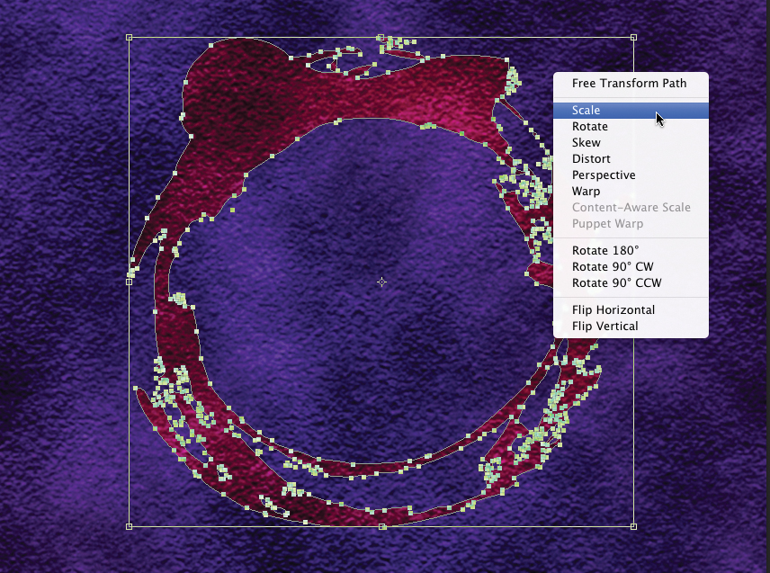 You can access several controls for the Free Transform command by right-clicking/Control-clicking. Try the following transformations on the Vector Shape layer. You can press the Esc key to cancel the transformation or Return (Enter) to apply it.