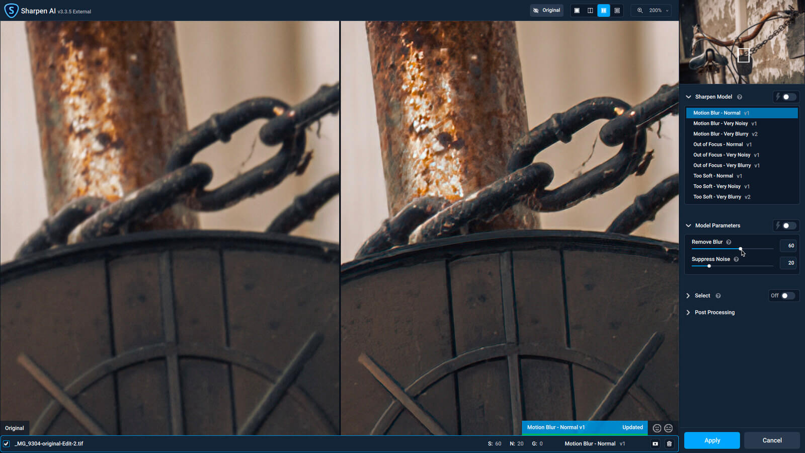 Next, we’ll refine the results by expanding the Model Parameters menu. Increasing the Remove Blur and Suppress Noise sliders, makes a substantial improvement in the overall clarity.