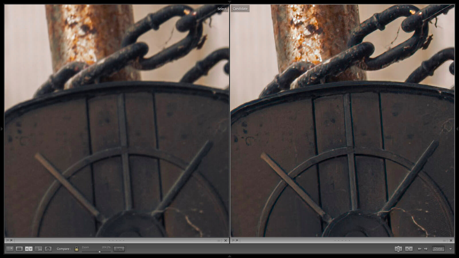 From Lightroom’s Library view, select the before and after images, then click the X/Y Comparison view, and zoom in the examine the details. The details in the “after” image are well defined and pleasing.