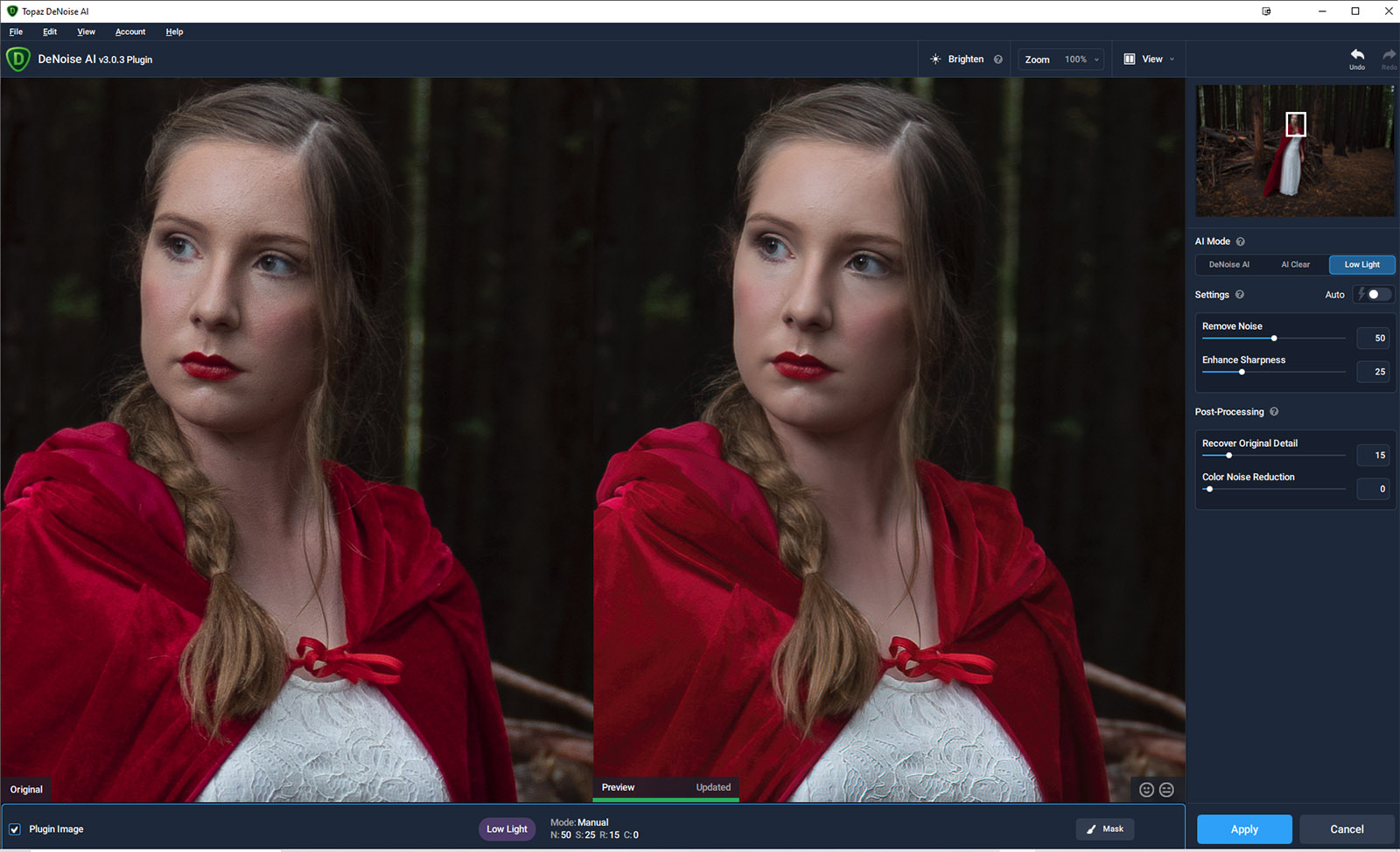 However, a few had some noise due to the low light situation. The other problem I had with just a few shots was the camera shake caused by the low shutter speed. In general, I had enough light on the models face for detail. At ISO 320 and 640, the noise really wasn’t that bad, but we can always strive for perfection, right? So could I save Little Red Riding Hood?