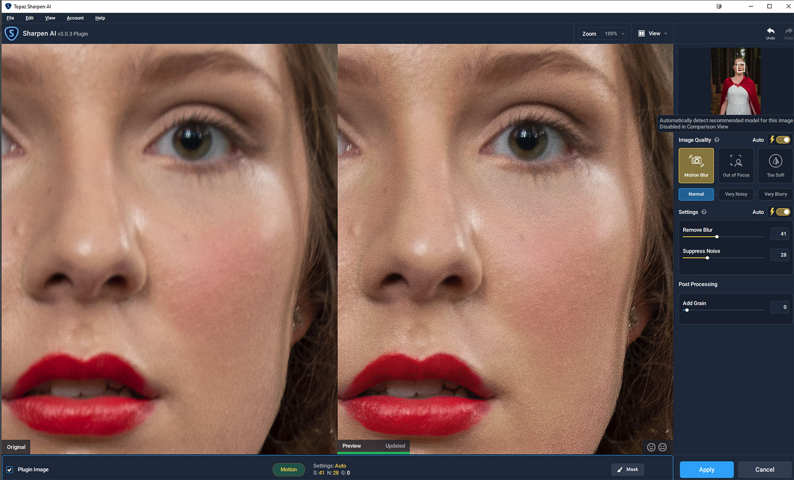 I tried a few variations and found that the Auto actually worked a little better. Sharpen AI detected the Motion Blur, and made the image a little more usable than the original, but what could I do about the noise?