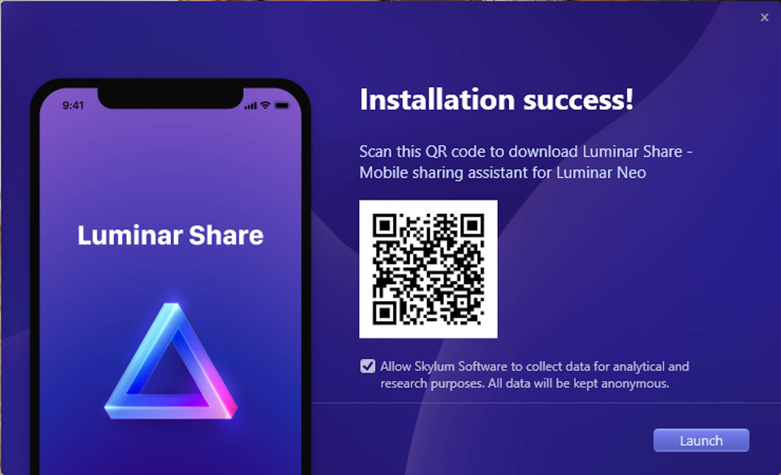 - Scan the QR code in Luminar Neo with the app.