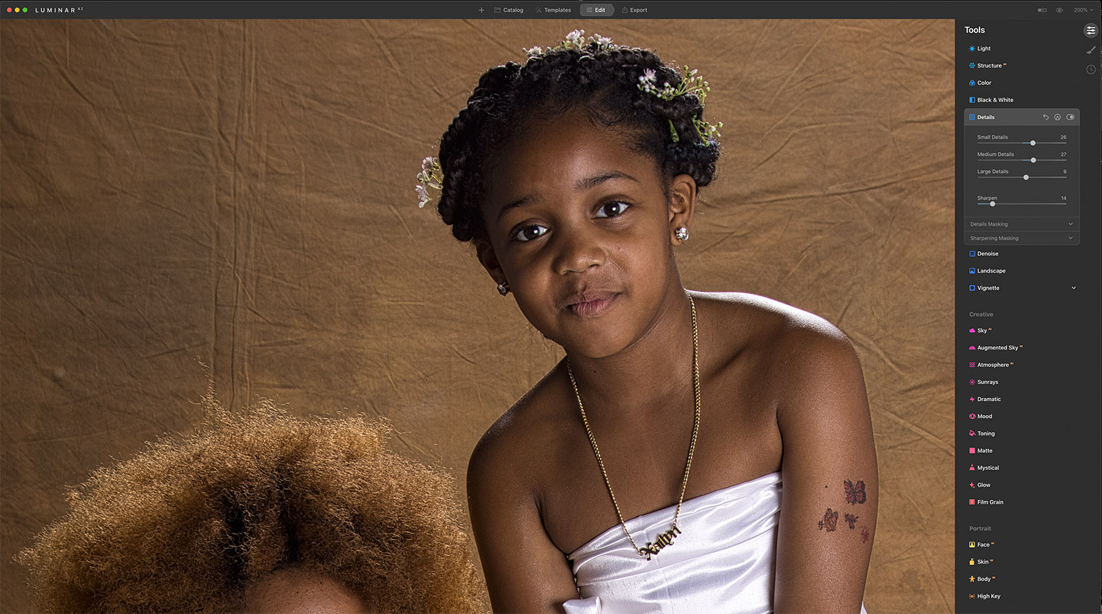 StructureAI is smart. The next screenshot shows the addition of structure. The background has a lot more detail in it, but Xialyn’s face doesn’t change thanks to LuminarAI. The next two photos show the difference between enhanced details and StructureAI.
