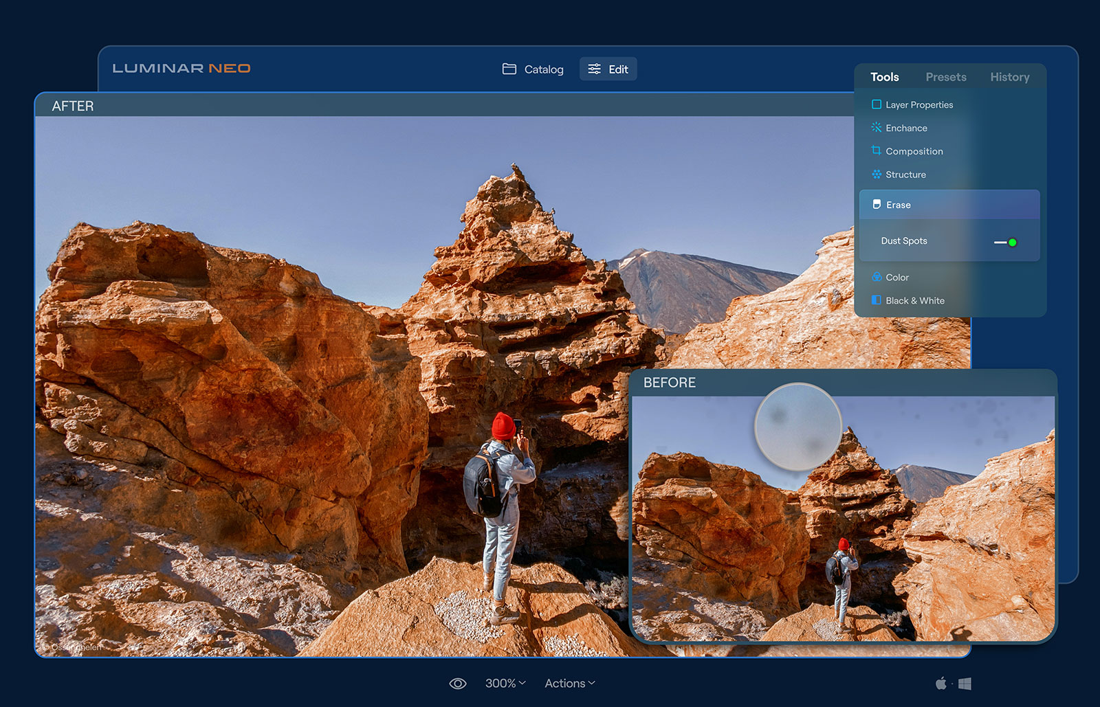 When capturing images in the field, artifacts can be introduced from dust on the surface of a lens or dust that finds its way onto the sensor during a lens change. After using AI to automatically detect these artifacts, Dust RemovalAI removes them to provide a spotless result. Now, artists can easily fix ruined photos, clean distracting spots in images, and save their beautiful memories.