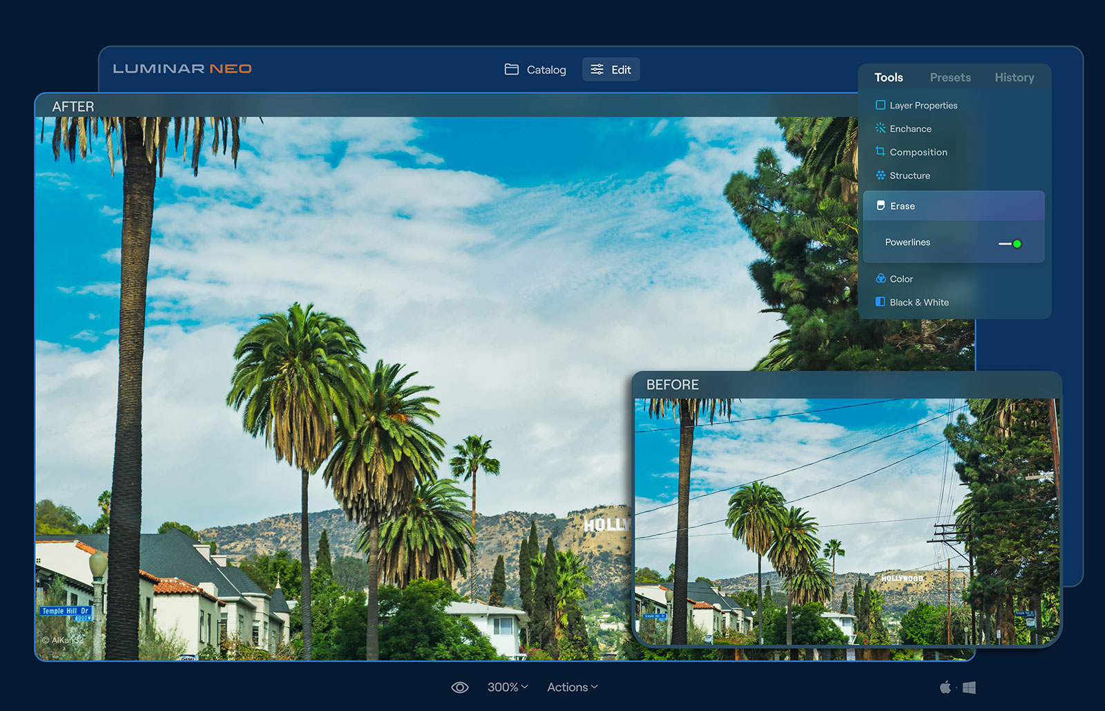 Used separately or as part of SkyAI, this new tool automatically removes unwanted power lines and phone lines from the sky in landscape photos. Whether editing photos of weddings, landscapes, or popular sightseeing spots, automatically getting rid of unwanted lines allows artists to focus on making powerful images, not cleaning up distractions.