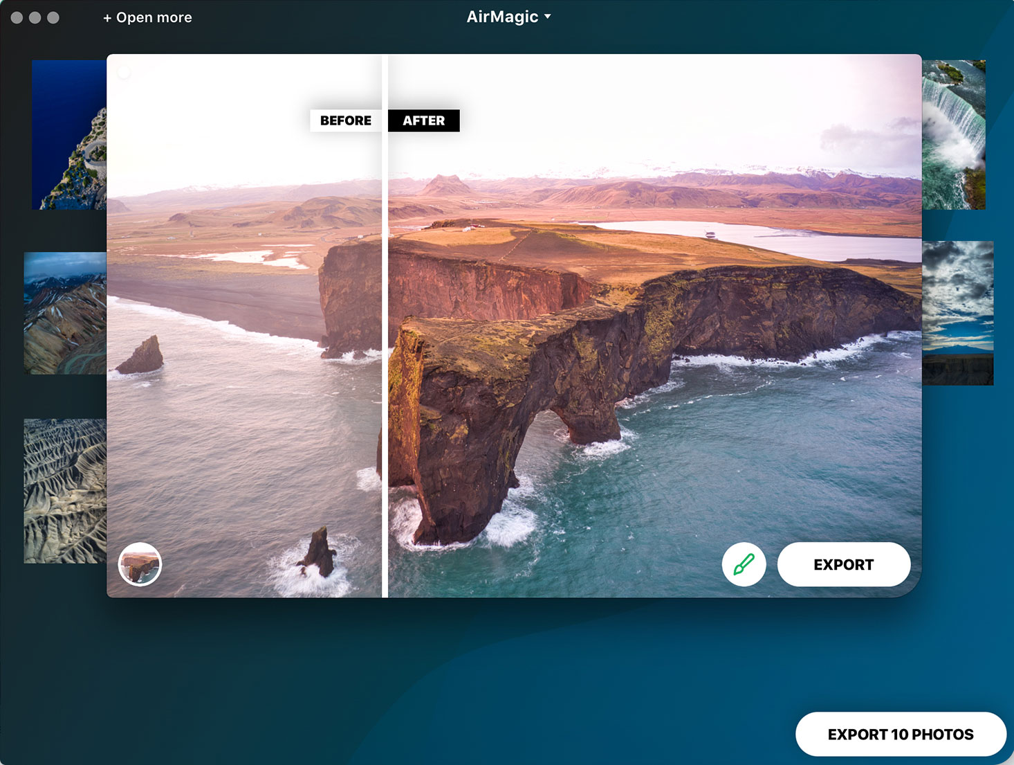 AirMagic uses smart algorithms and AI, applying modifications such as color reveal, haze removal, sky enhancement and more.