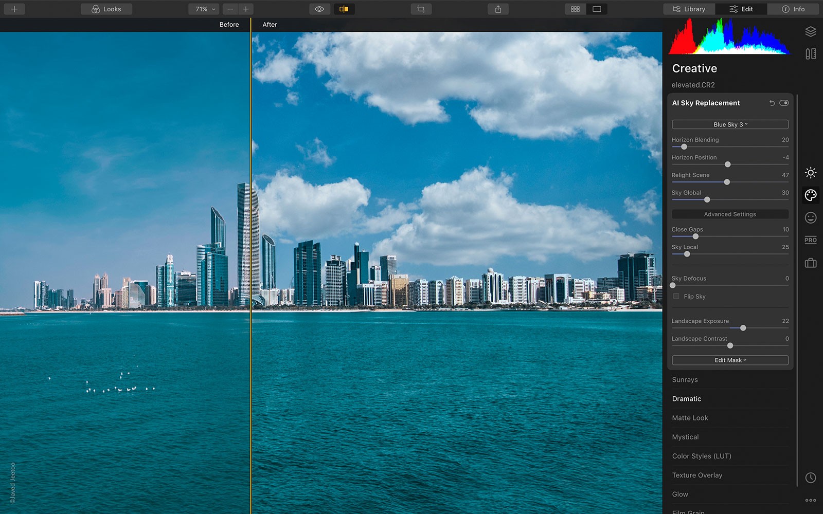 Previous sky replacement techniques often brought unwanted artifacts and halos into the scene, but these are a thing of the past with Luminar 4. AI Sky Replacement will also relight a scene, and allow for you to adjust things like depth of field, tone, exposure and color.
