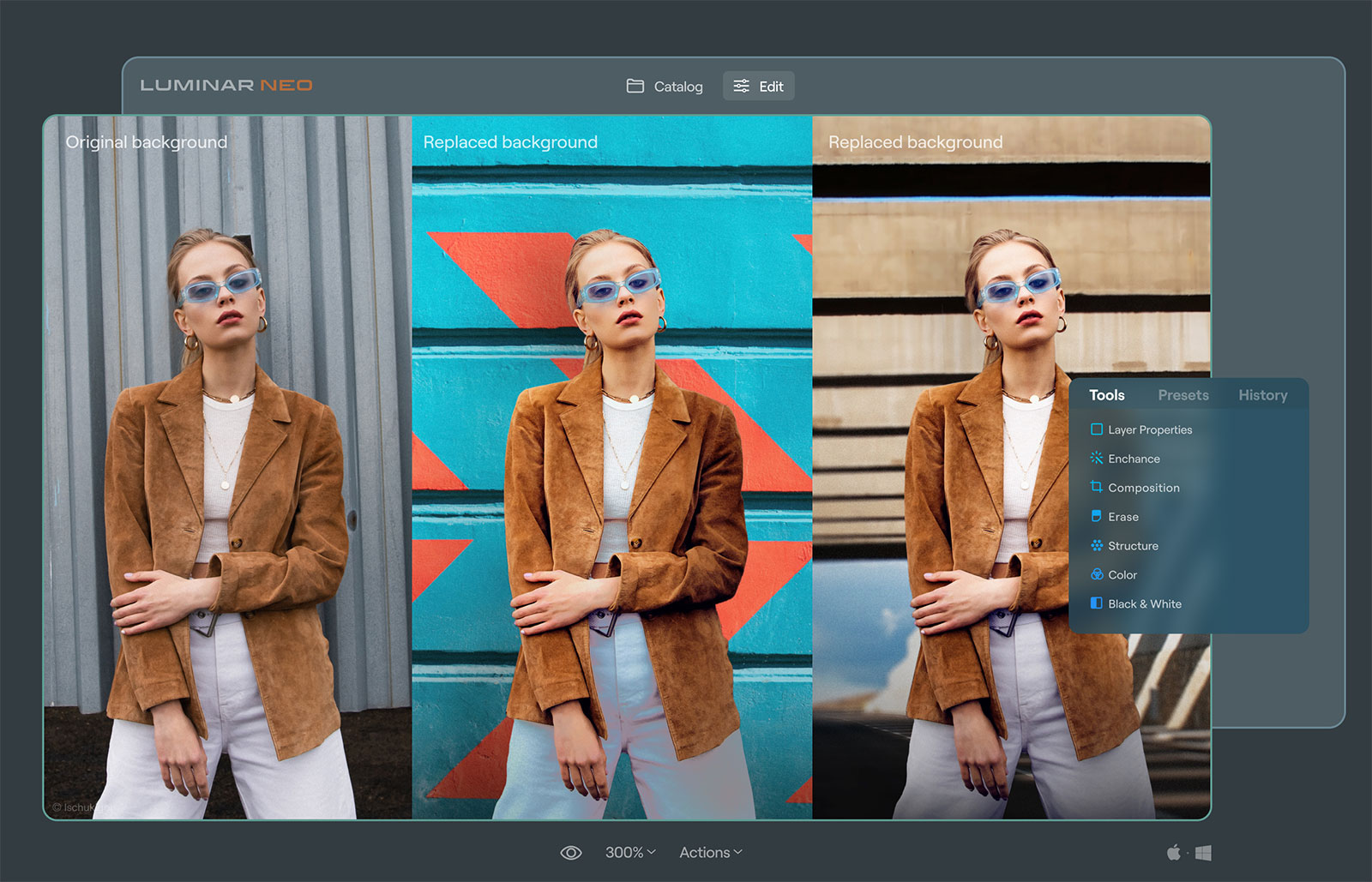 Human aware AI in Luminar Neo allows an artist to cleanly isolate the subject and remove the background altogether with just one click. While automatic background removal is generally sufficient, edges can be refined quickly.