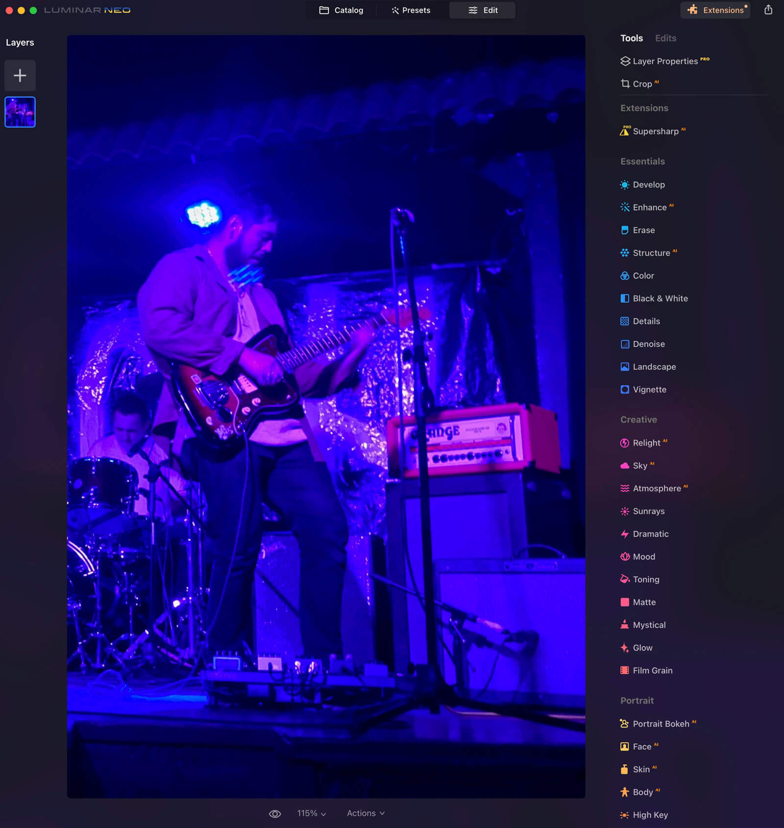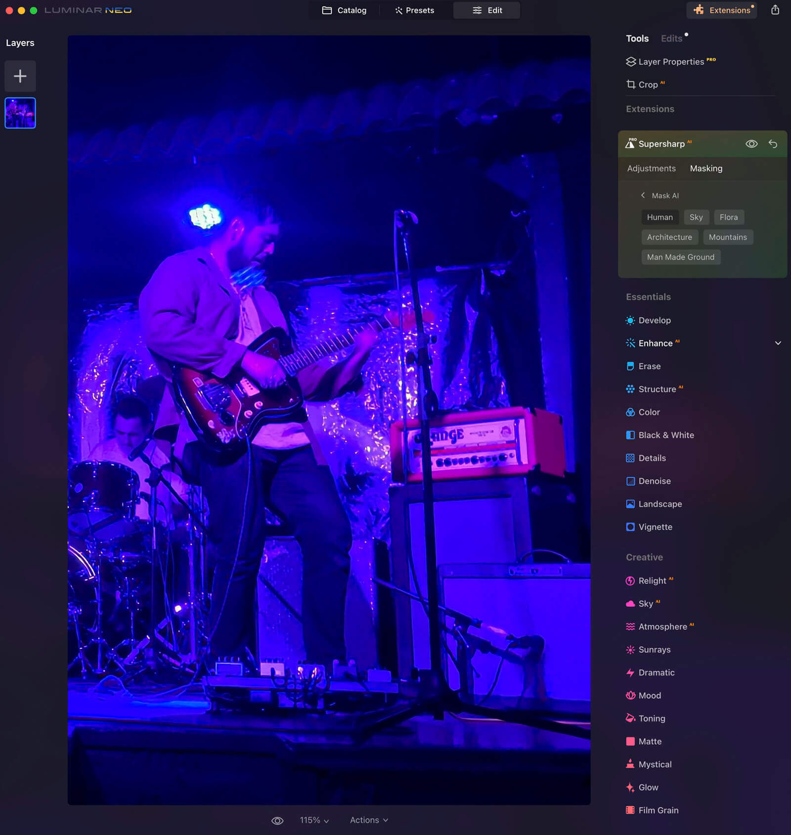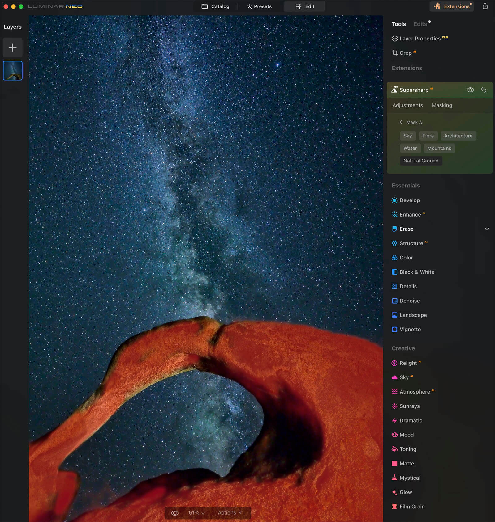 Unlike Upscale AI, another one of the Extensions in Luminar Neo, Supersharpen AI appears in the Edit Menu in the Extensions section. I had difficulty finding it at first since Upscale AI appears to the right of the photo in the Catalog.