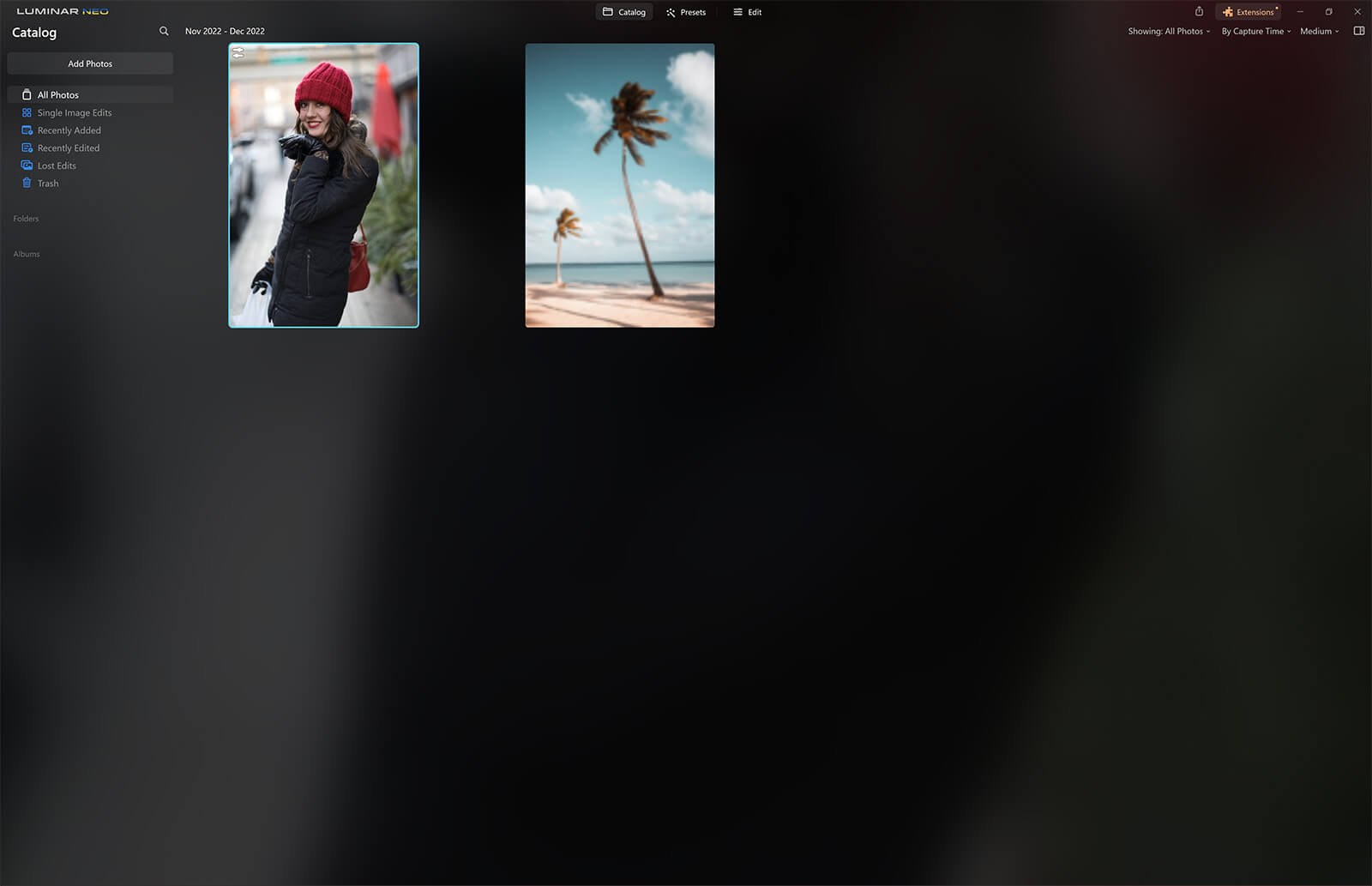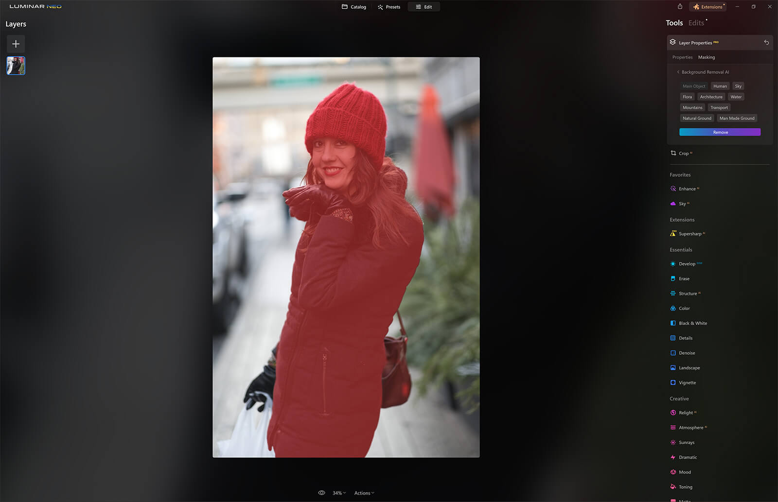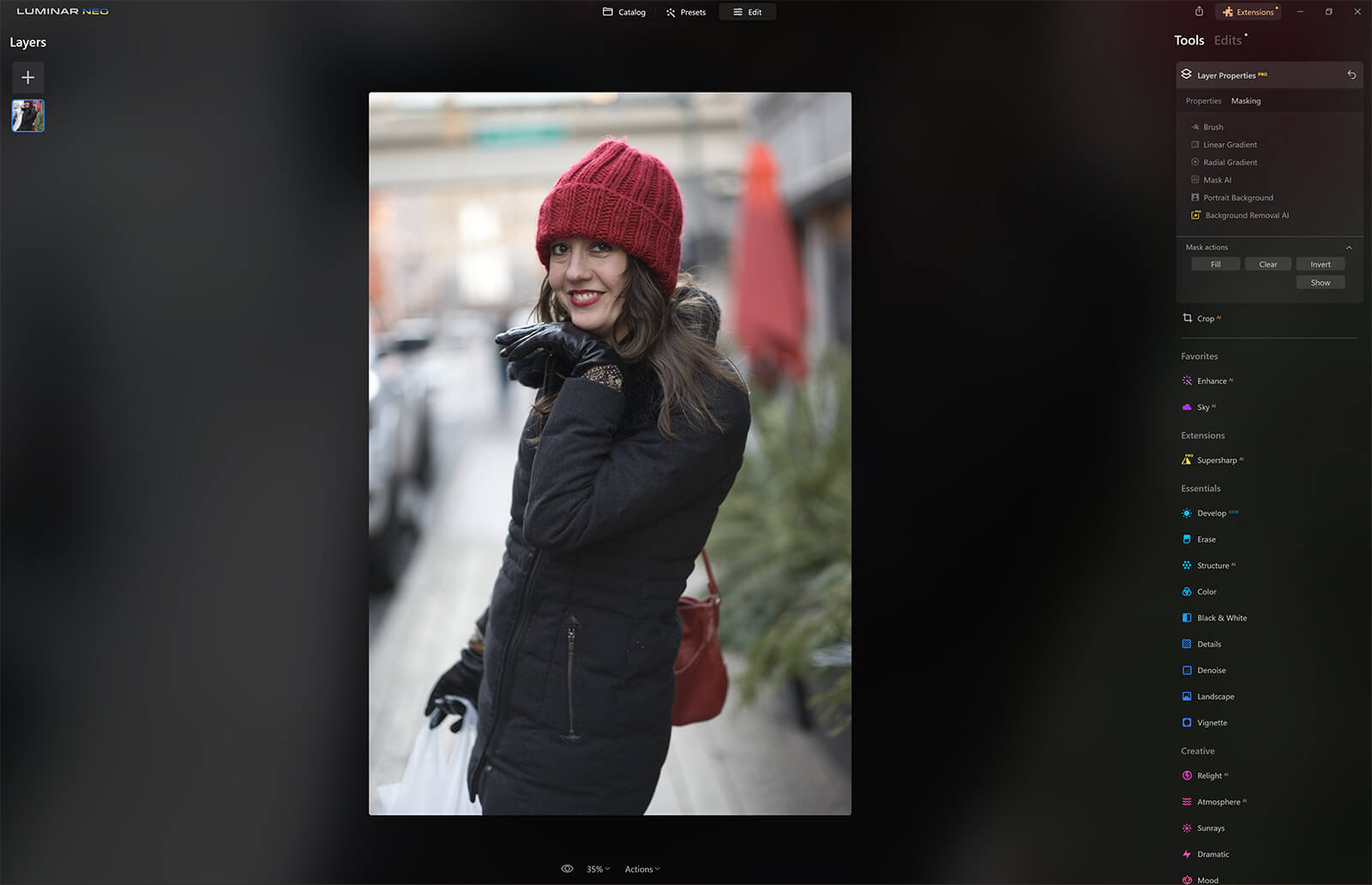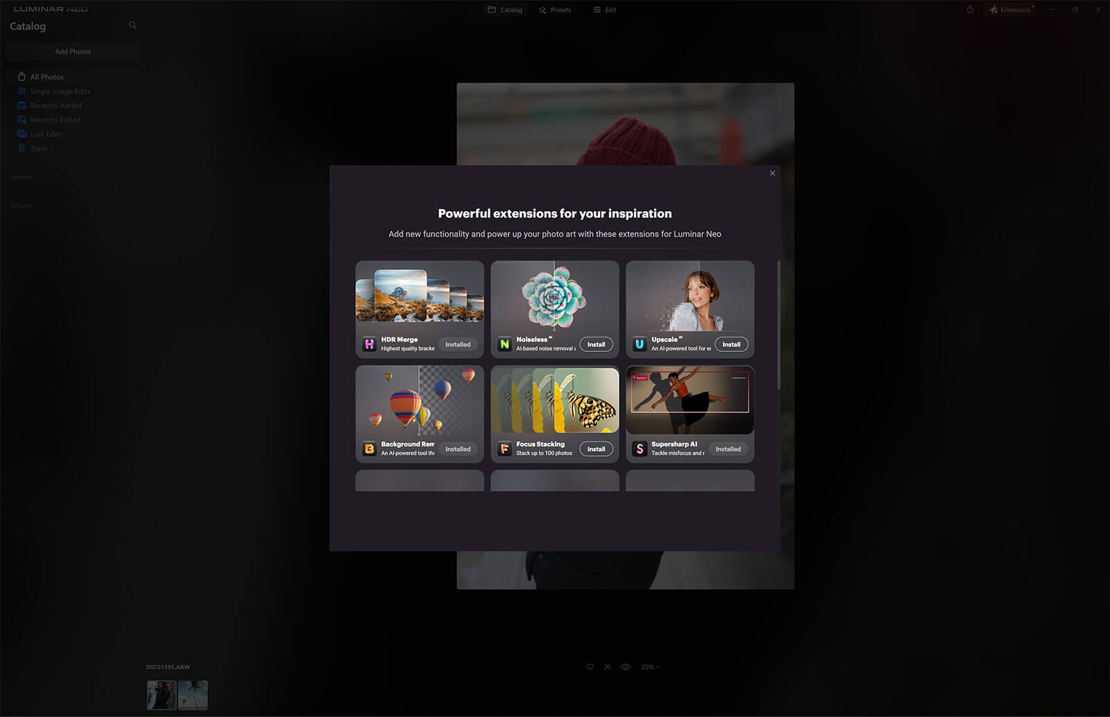 If this is your first time using the Luminar Neo background removal AI extension you will need to download it from the extensions tab at the top right of your screen. Once you’ve done that, double-click your photo and click edit to start editing.