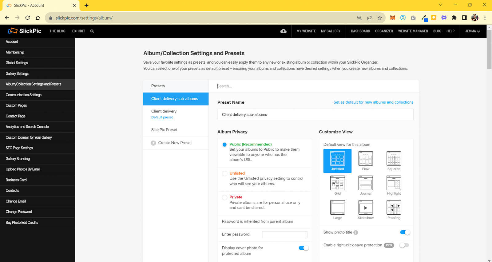 When creating a new album there is now an option in SlickPic to save your settings as a new preset. This means you can reuse all your choices like the default view, the password, privacy, and so on without having to select them again for each album.