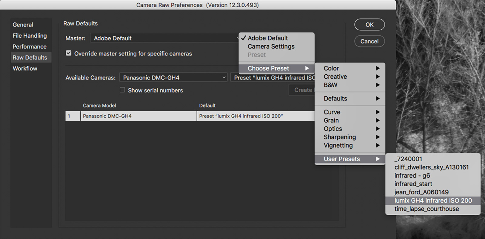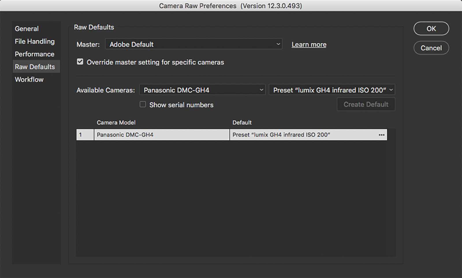 Override specific settings for specific cameras. Choose your camera. If you have multiple cameras of the same model, your can check the Show serial numbers box to target that specific camera. New in ACR 12.3, you can also have separate settings for the same camera with different ISO values.