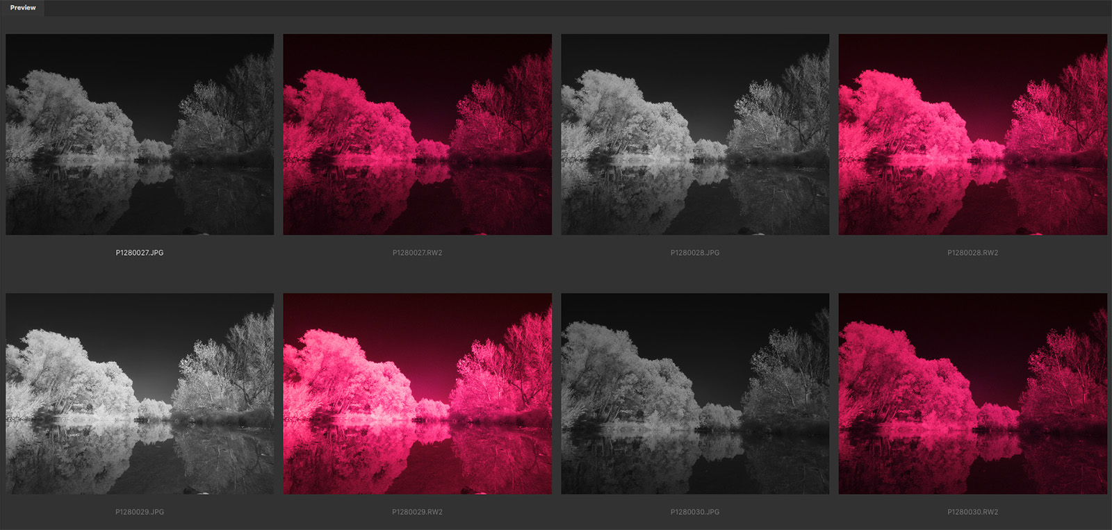 When photographing with the 720NM filter while shooting IR, you end up with a magenta file. In the past I always shot RAW+JPEG with the camera set to monochrome in order to see what the files looked like in black and white. With the Default profile enabled, images are automatically converted to black and white.