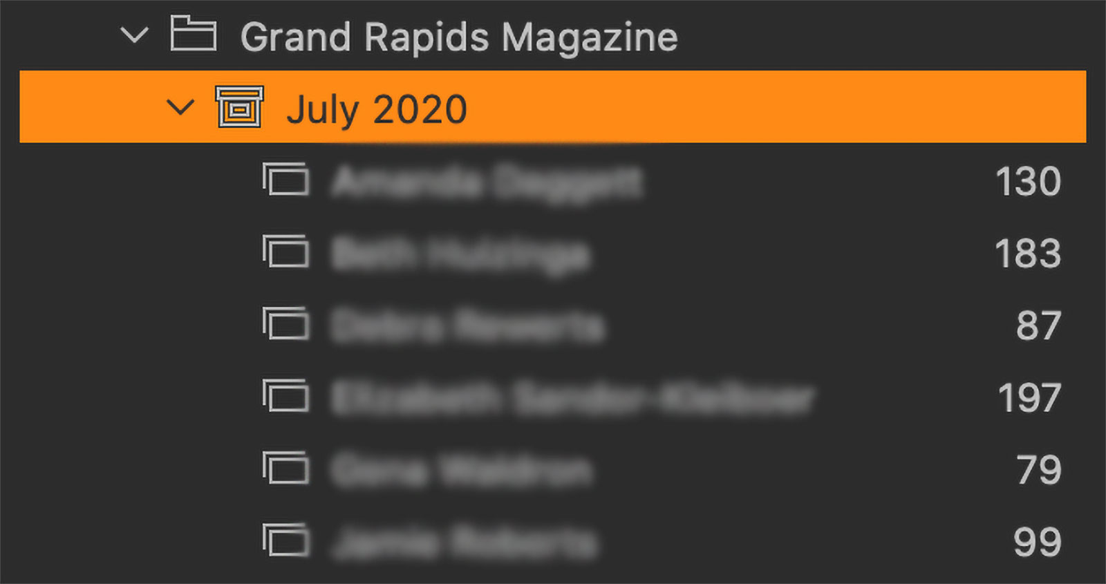 If I expand one of those sub-groups for a client, you’ll see an individual project. In this example, I photographed several people for a local magazine for an upcoming July issue. So the project is the July 2020 issue, and underneath that are nested albums.
