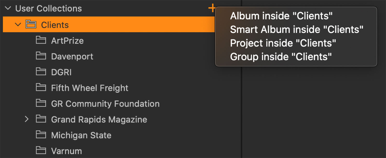 - Project: If you’re used to Lightroom, think of a Project like a Collection Set. These again can’t hold any individual photos. You can nest groups, albums and smart albums inside of projects.
