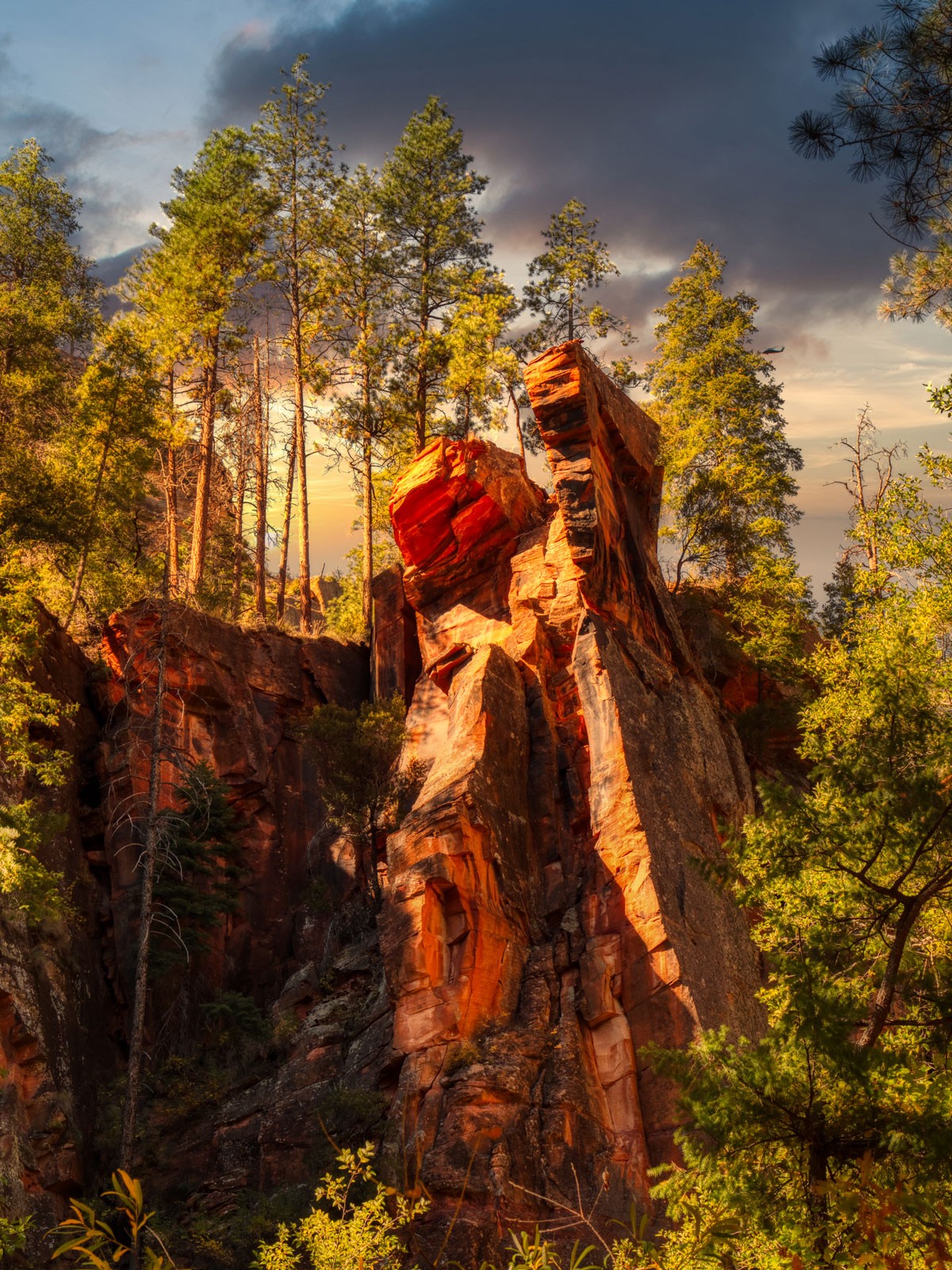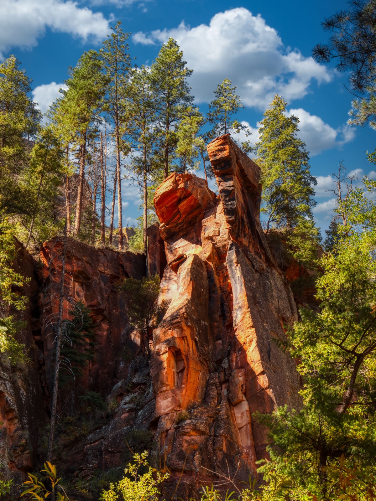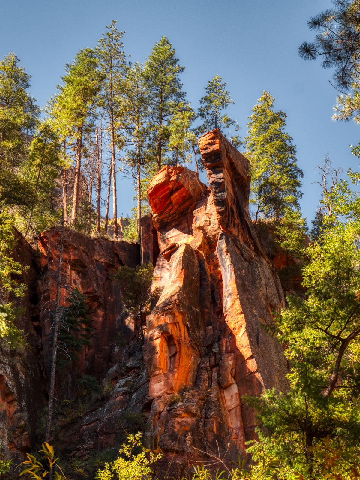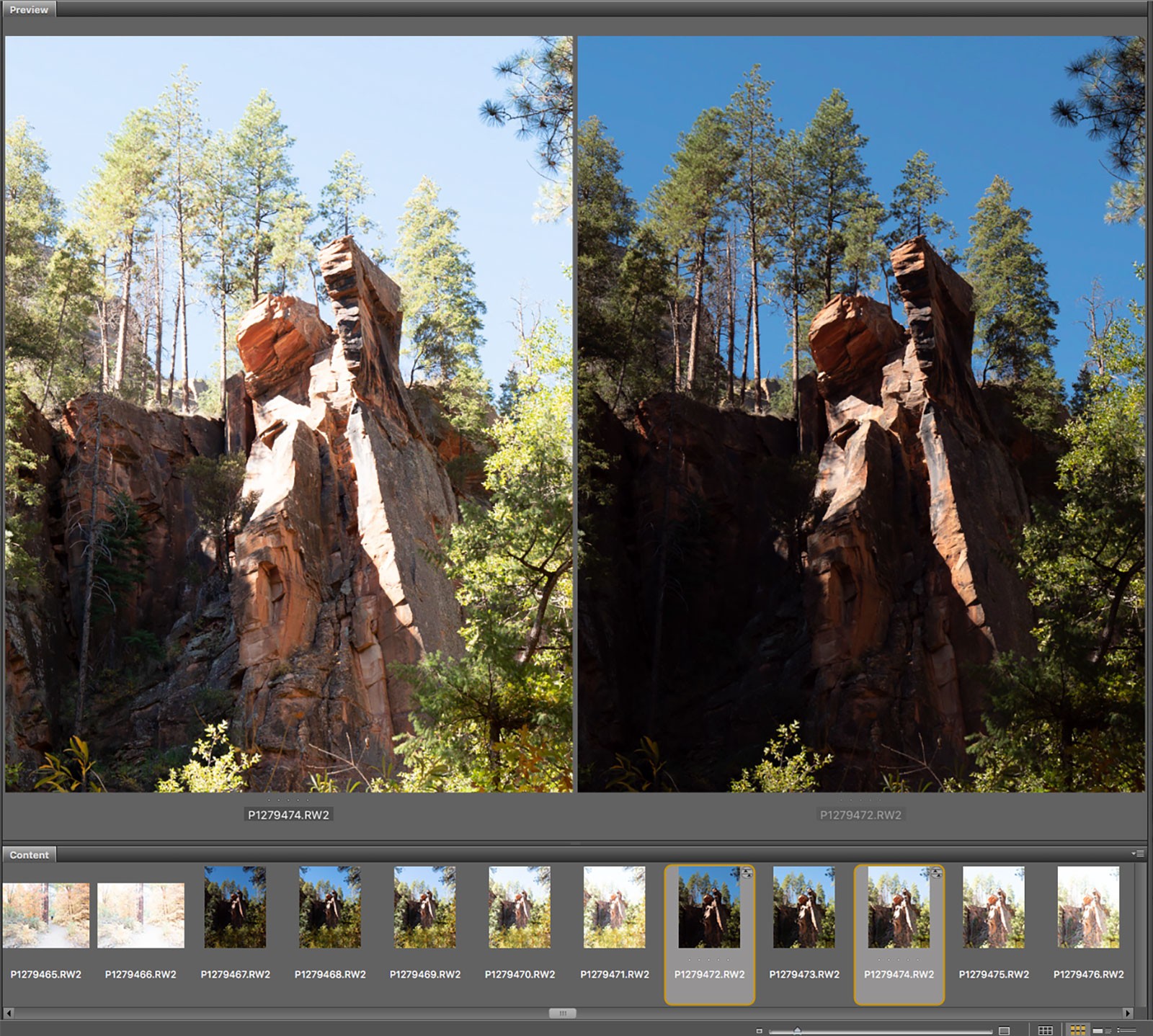 I was hiking in West Fork Trail above Sedona, AZ in Oak Creek Canyon. I came across a red rock outcrop that captured my imagination. As with many canyon scenes, there was contrast galore. As you can see by the screen capture of my Adobe Bridge window no single image would tell the story properly. I made a five-image bracket with each one stop apart.