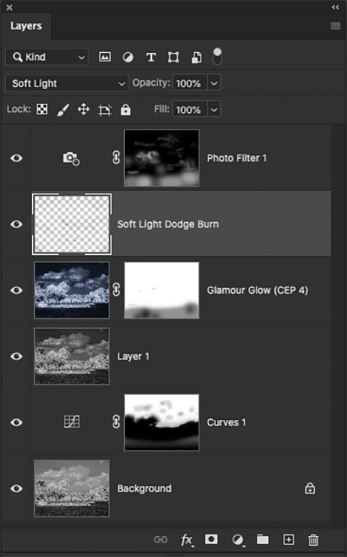 A Curves Layer was added to darken sky. Layer 1 is a merged from the Background and Curves. NIK Filters Glamour Glow filter was utilized, too. The Soft Light layer was employed to enhance shadows and highlights to add depth and dimension.