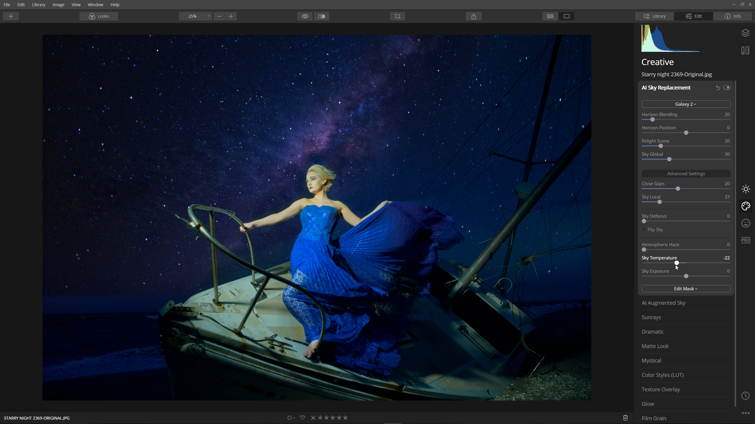 I chose to use Galaxy 2 that ships with Luminar, but you can add your own sky if you like. I tweaked Closed Gaps to mask around the many ropes and wires of the boat. The rest of the settings, Luminar already selected using AI technology.