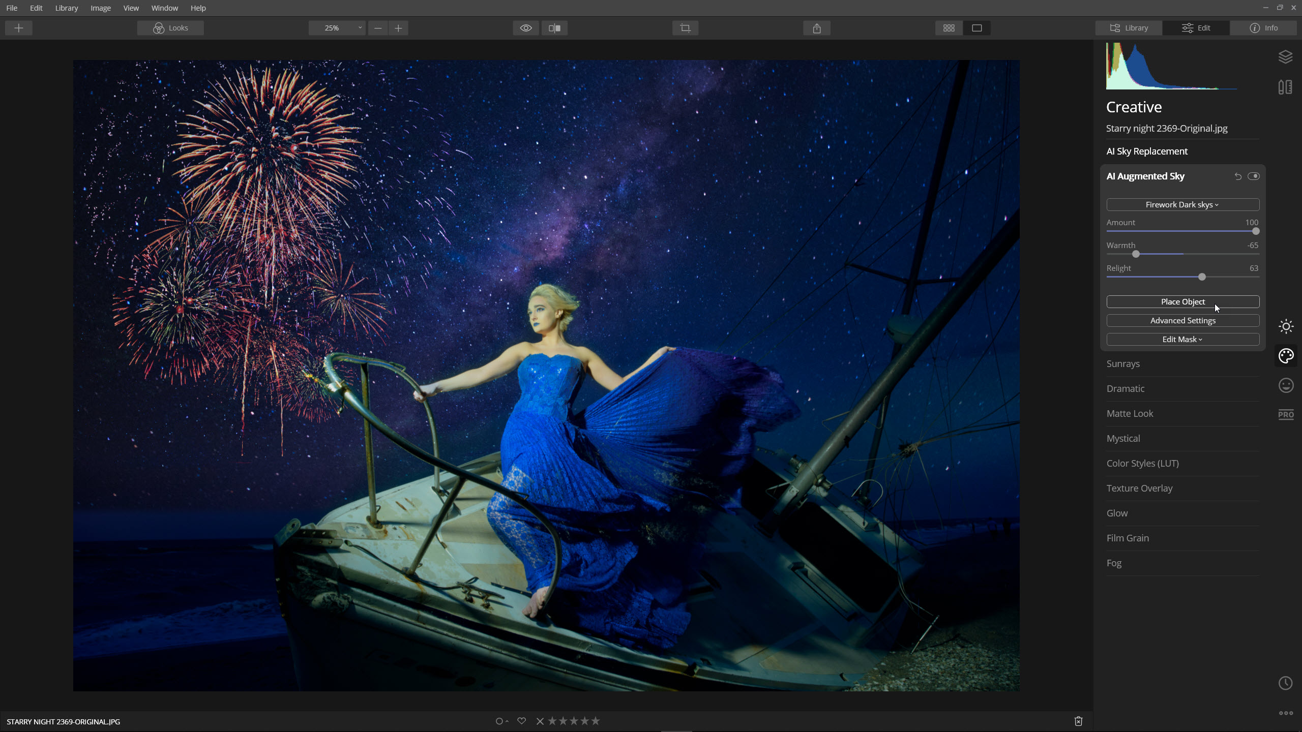 Part of being creative is knowing when to stop. The image looks very good at this point, so I could stop here or add one more tool — AI Augmented Sky. Select an element and add it to the image. I chose to add Fireworks and then moved it into position by choosing Place Object.