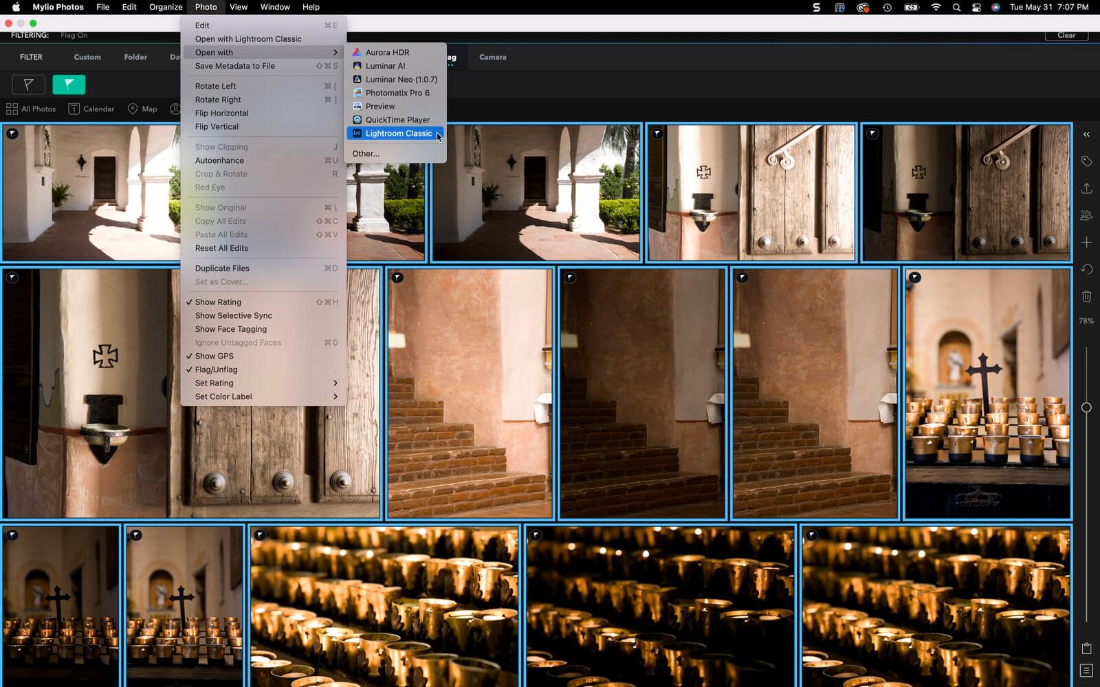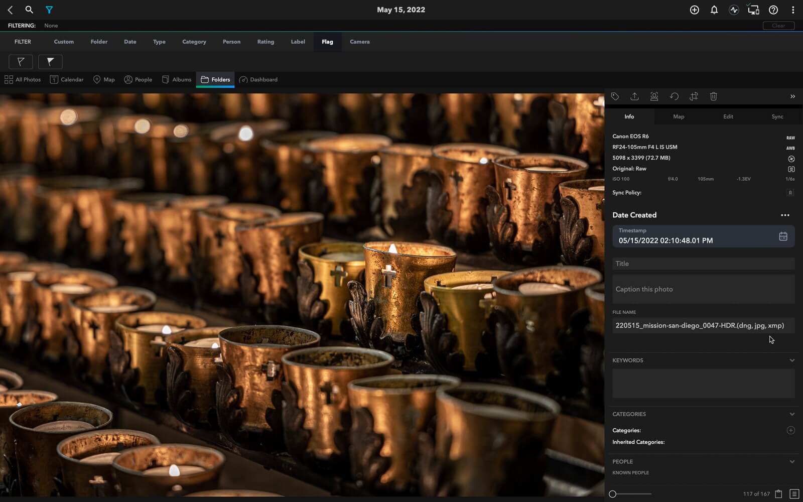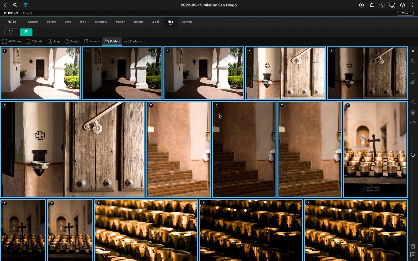 Start by importing your photos into Mylio Photos. Once your photos are added, select your favorites. In this example I’m working with a set of images from a camera club outing to the historic Mission San Diego. I culled my images and used Flags to mark my favorites.