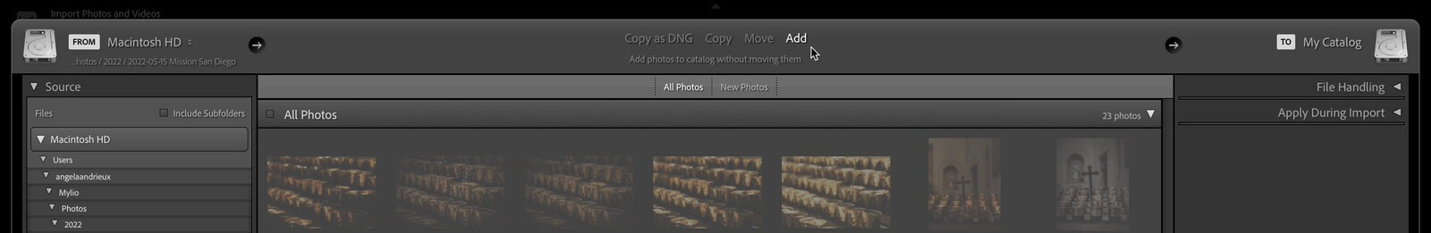 This will launch Lightroom’s Import dialog. Choose to Add the photos from their current location, then click Import.