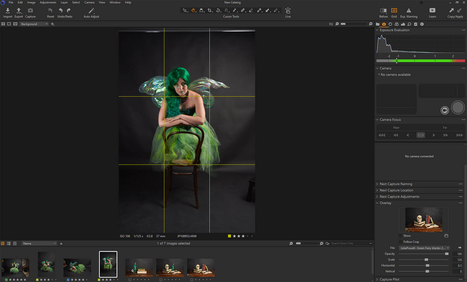 Trying to create composites in the studio can get a little tricky, making sure everything lines up. I have often in the past taken multiple images of poses and body parts so that I have extras to work with. Using the Overlay tool makes it super easy to make sure all poses match your final composite image with ease. Like with the Absinthe Green Fairy. I wanted to ‘shrink’ my fairy down to be able to interact with books, skulls and other props for the shoot. Not only is it great for checking everything lines up, but you can also make sure all the lighting is consistent too.