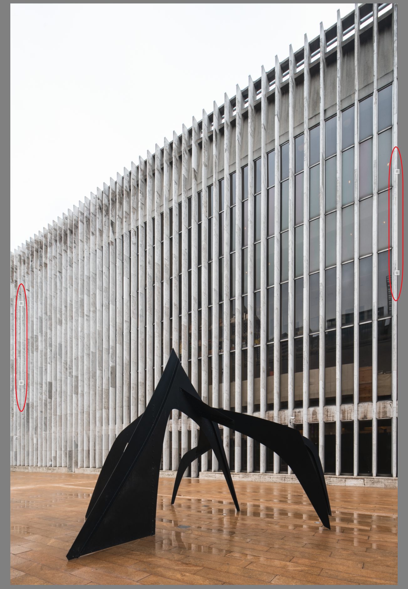 For example, one the left side below, you have the original image, with the background building leaning backward. I wanted the lines of the white building to be vertical, to emphasize the black sculpture in the foreground (right).