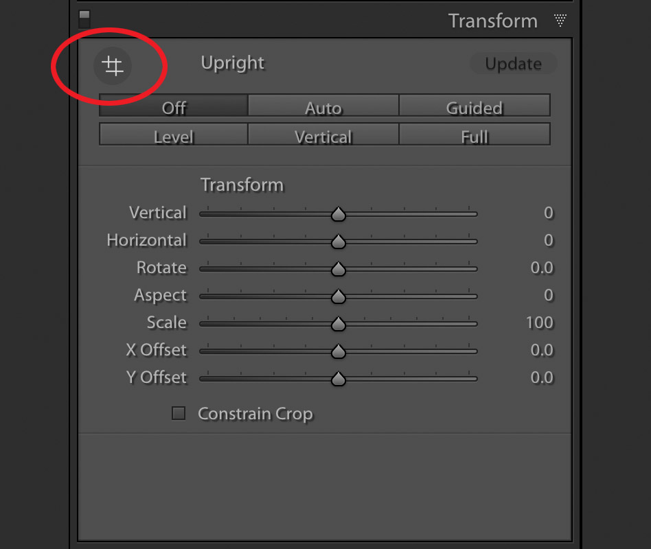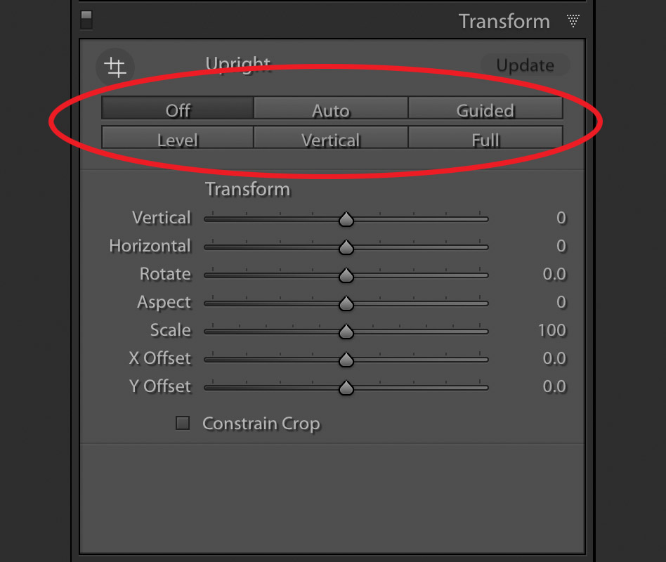 So how did I do that? In Lightroom, head over to the Develop module. On the right, you’ll find the Transform panel. For our purposes, you can ignore the sliders below unless you want to do everything manually.