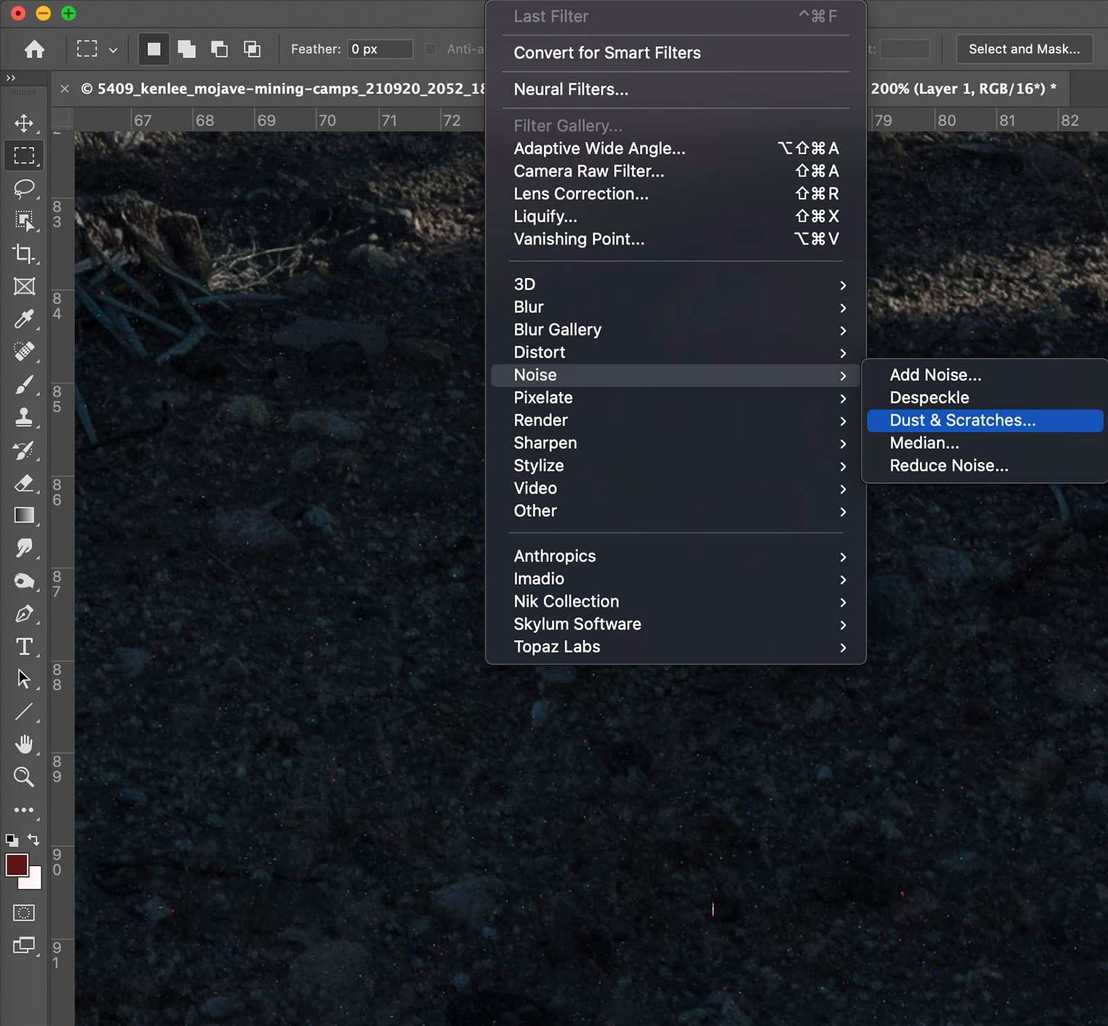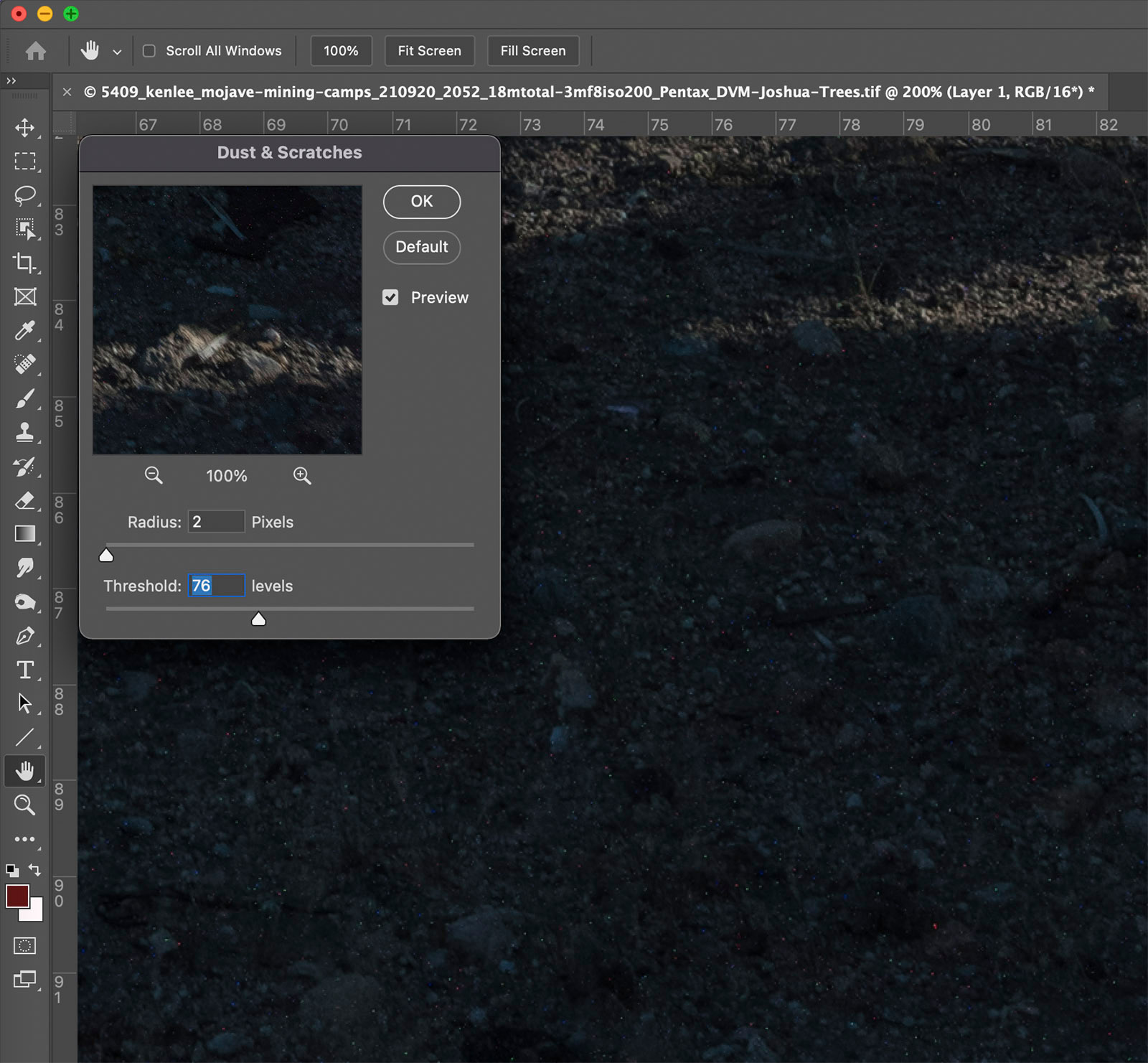 Above, I used the Dust& Scratches filter in Photoshop to remove hot pixels. This is viewing the image at 200% zoom.